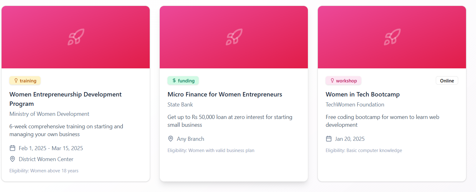 - UX/UI notes and sample screens • Home screen: Quick actions (Report Issue, Find Courses, Jobs, Health Alerts), recent tickets, local news/events. • Report screen: Simple flow: Category -> Location -> Photo/Voice -> Submit. • Dashboard: Map + list toggle, quick filters, SLA indicators. • Course page: Description, schedule, enroll button, mentor contact. • Women Hub: Cohorts, training calendar, loan status. Design principles: large tappable targets, icon-driven navigation, one-action-per-screen for simplicity.