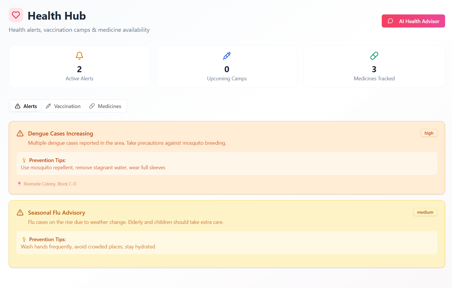 - Key features Each feature below includes a short description, important UI elements, and data points to record. A. Complaint reporting & tracking (Civic Issues) • Report types: Water leakage, Broken streetlights, Garbage issues, Road damage, Other. • Submission modes: Text form, photo upload, voice description (auto-transcribed), quick templates. • Geo-tagging: Automatic GPS (with manual pin-drop override). • Local authority routing: Map each complaint to responsible department/ward. • Status updates: Pending -> Assigned -> In progress -> Resolved -> Feedback requested. • Timeline & notifications: Push/SMS/local-language voice updates for status changes. • Commenting & evidence: Residents and officials can add comments, photos, timestamps. • Escalation: Auto-escalate complaints that exceed SLA thresholds. • Analytics: Dashboard with heatmap of complaints, avg resolution time, pending backlog. Data captured: reporter id (optional anonymous), geolocation, category, photos, audio, timestamp, assigned team, status history. B. Dashboard • Community dashboard: shows all reported issues with filters (by status, category, time-range, location). • Authority dashboard: prioritized ticket list, SLA indicators, assignment actions, map view. • Volunteer view: queue of unverified local issues to validate on the ground. • Public view: aggregated statistics and transparency portal (no personal data). C. Voice-first interface • Voice commands: e.g., "Report a water leak at Main Street"; "Show pending complaints near me"; "Find free tailoring course". • Language support: Local languages + simple phrases. • TTS for notifications: Voice notifications for users with low literacy. • Offline voice capture: Record audio that syncs when connection returns. Core tech: On-device speech-to-text with fallback server transcription; text-to-speech for messages. D. Learning & Mentorship Hub • Course discovery: Nearby & online free/low-cost skill courses (filters: category, cost, mode, schedule). • Local trainers: Profiles, ratings, contact methods, scheduled classes. • Micro-internships: Short assignments from local businesses (1–4 weeks) with clear deliverables. • Mentorship matching: Students apply, matched with volunteer mentors; mentor calendar & chat. • Progress tracking & certificates: Course progress, quiz scores, attendance, certificate generation (PDF & shareable). Data captured: course id, trainer id, enrollment, progress %, certificates issued, feedback. E. Women Entrepreneurship Support • Training modules: Business basics, tailoring, food processing, digital marketing, bookkeeping. • Micro-grants & loans links: Connect to local microfinance partners (application tracking in-app). • Marketplace integration: Option to list goods/services on a local marketplace. • Mentor & peer groups: Women-only cohorts, success stories, local demo days. F. Jobs & Job Training • Job board: Local & region-specific jobs with filters (remote, part-time, sector). • Skill-gap training: Quick courses mapped to job requirements. • Application tracking: Track job applications, interview invites. • Employer portal: Local businesses post openings and micro-internships. G. Health Alerts & AI Health Assistant • Broadcast alerts: Dengue, flu, vaccination camps — geo-targeted push & voice alerts. • Pharmacy stock tracker: Pharmacies can report stock status of essential medicines. • AI health chatbot: For basic triage, symptom checks, and guidance to nearest clinic (clearly labelled as non-diagnostic). • Campaigns: Vaccination drives, health camps, maternal health reminders. Safety note: The AI chatbot must display disclaimer and escalate red-flag symptoms to human health worker contact info. H. Community Engagement & Governance • Polls & surveys: Collect resident feedback on proposed projects. • Event calendar: Training sessions, demo days, health camps. • Volunteer coordination: Rosters for local cleanups and repair validation.