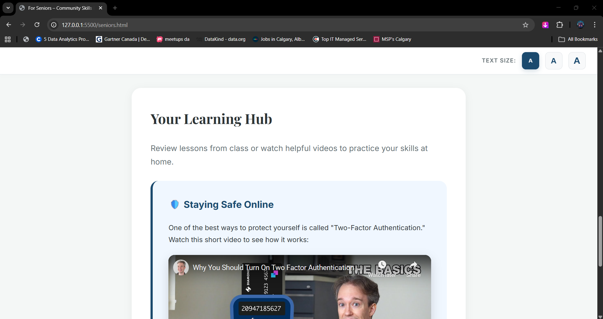 A key challenge was creating a fully functioning website under a tight time constraint while keeping the design friendly and accessible for both youth and seniors. We addressed this by prioritizing essential features, using standardized templates, and testing usability for both audiences.