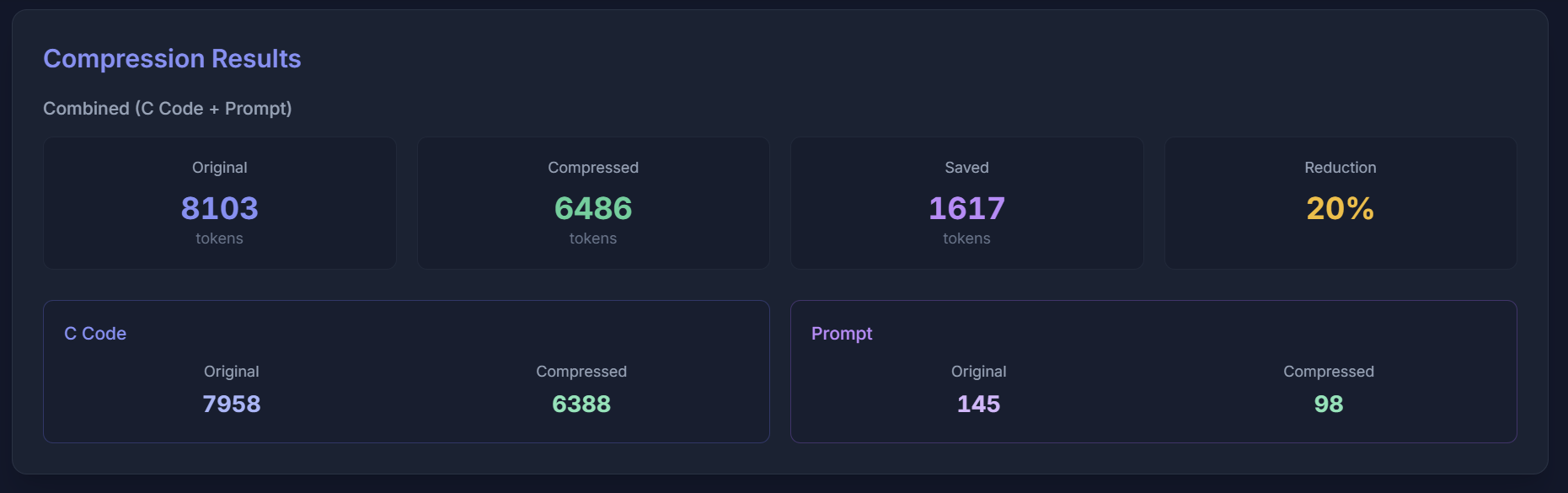 We were inspired across many domains of programming and research. With the increased use of LLMs in programming, especially with the advent of agent-based programming, optimizing token use for these models is increasingly critical in today's world. More specifically, we wanted to target token use specifically for code. Despite this focus, we also implemented a near-SOTA semantic based compression algorithm based on TCRA-LLM: Token Compression Retrieval Augmented Large Language Model for Inference Cost Reduction.