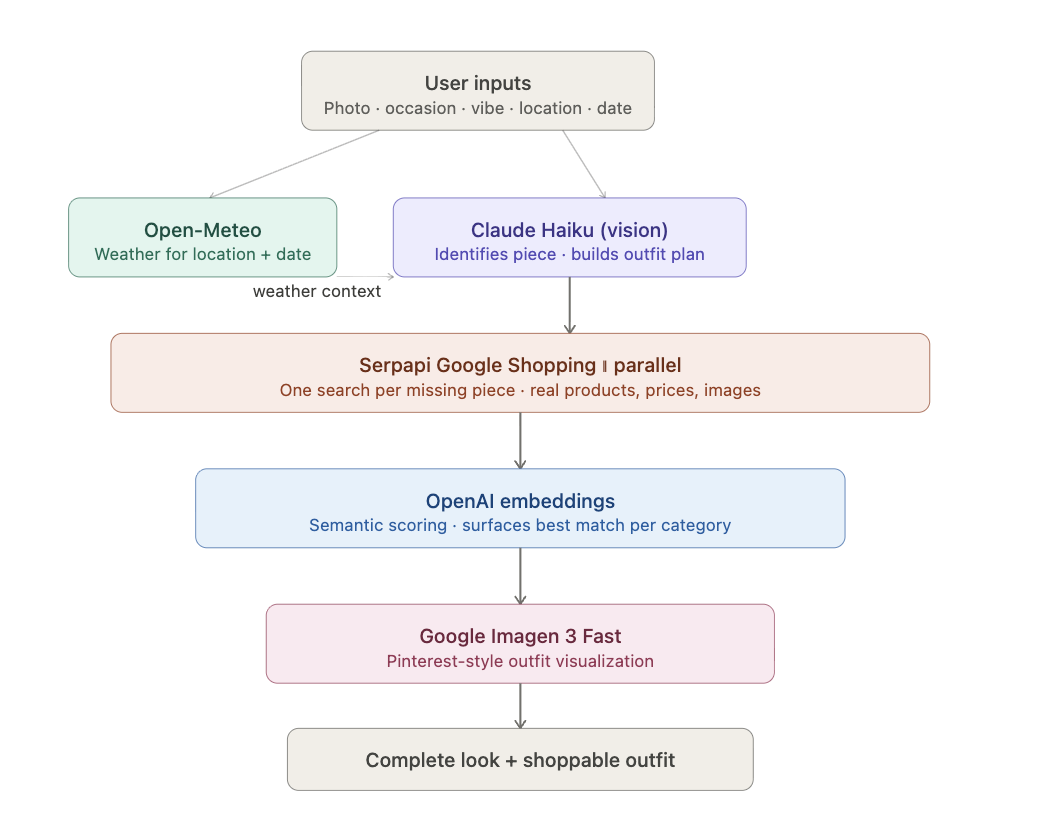 Latency. The pipeline is inherently sequential. Parallelizing all Serpapi searches and embedding calls with Promise.all combined with a tight Claude prompt keeps end-to-end latency under 10 seconds for a full outfit.