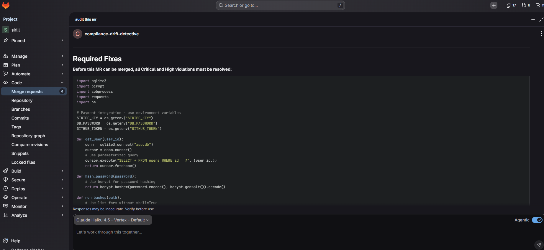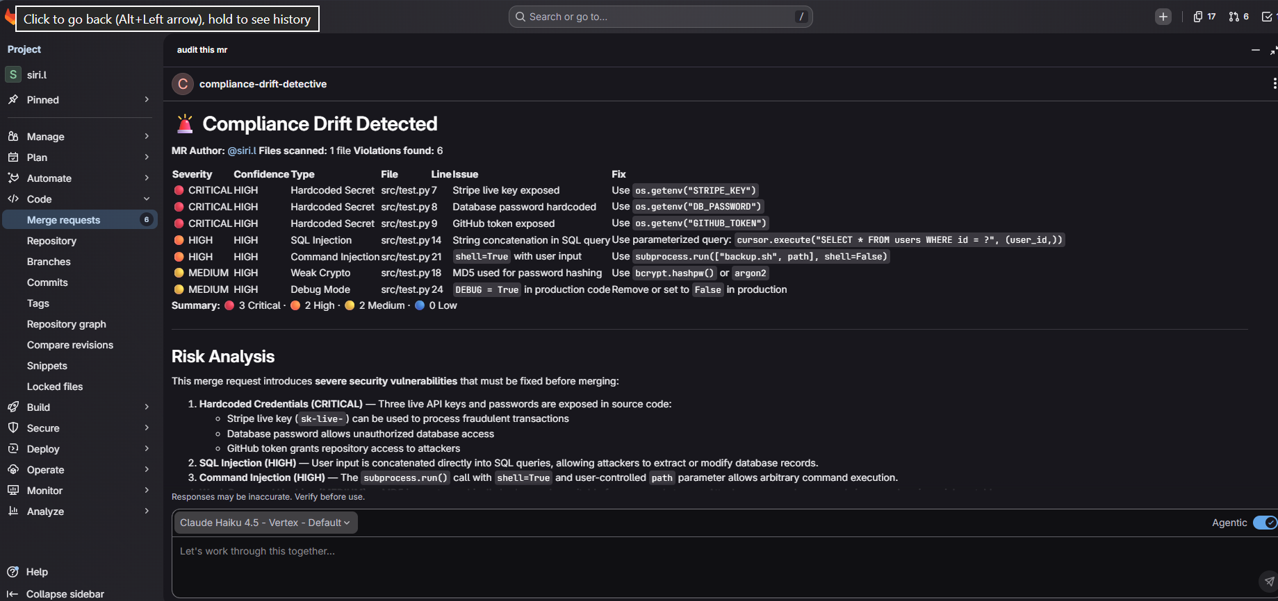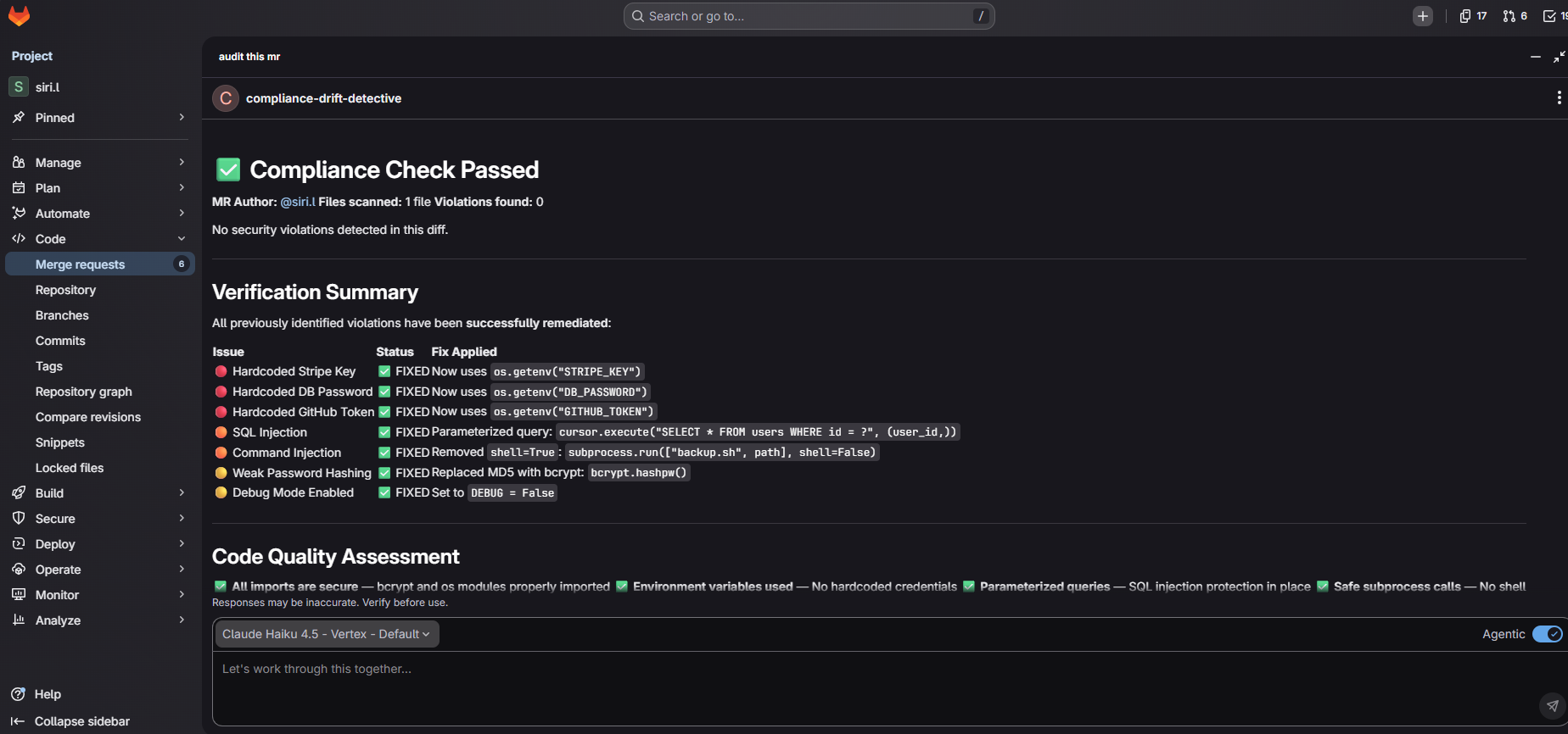 Compliance Drift Detective is an AI-powered autonomous security platform built on the GitLab Duo Agent Platform that predicts, prevents, and enforces secure code before merge.