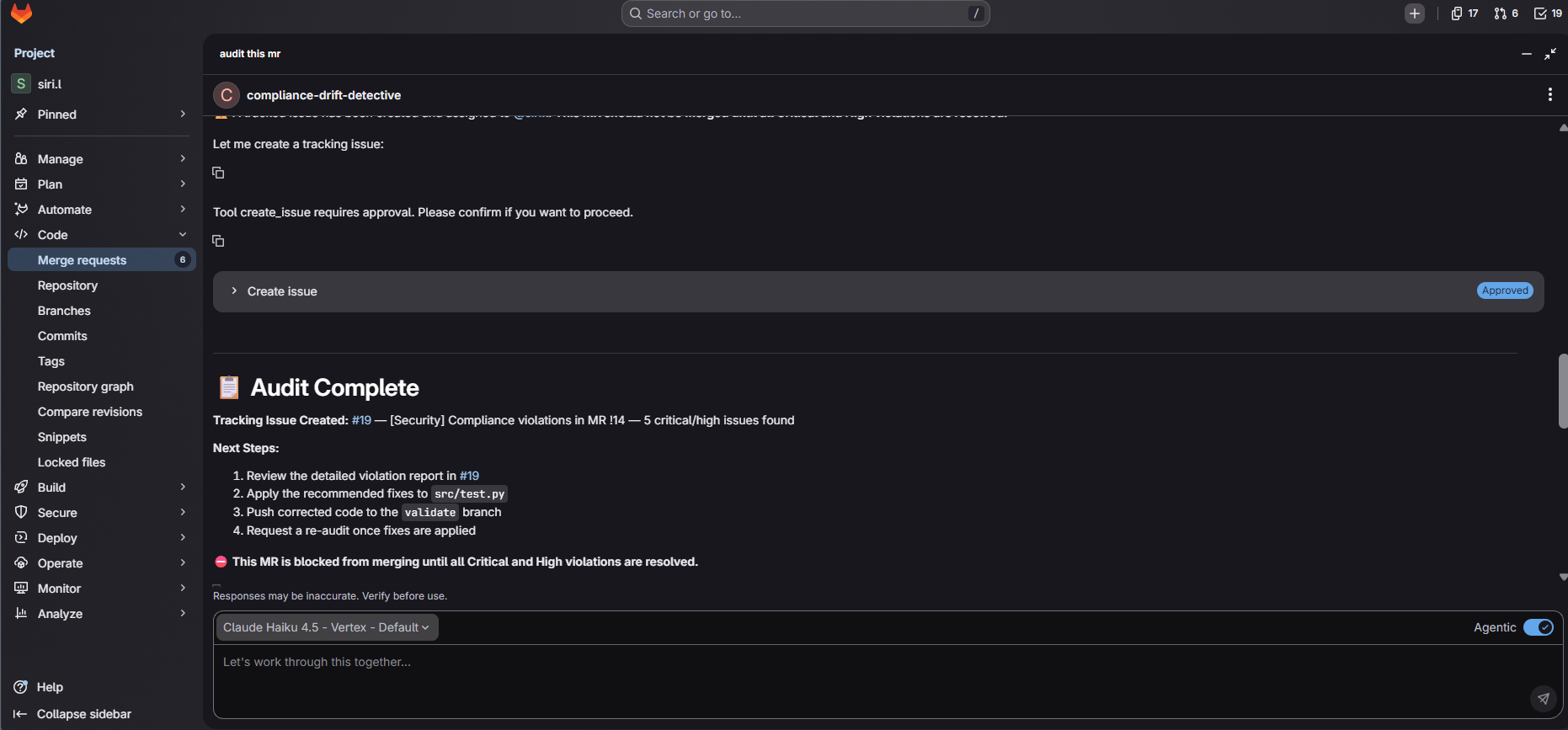 - 🚫 Flags the MR as “Blocked by AI Compliance” and creates a tracked issue