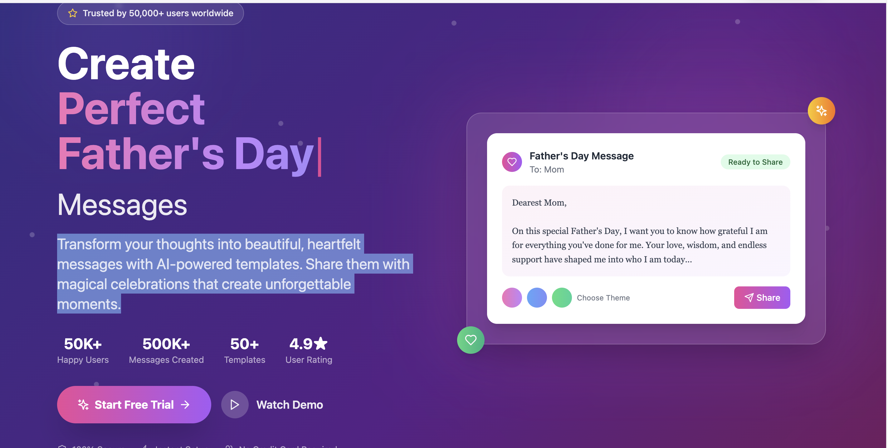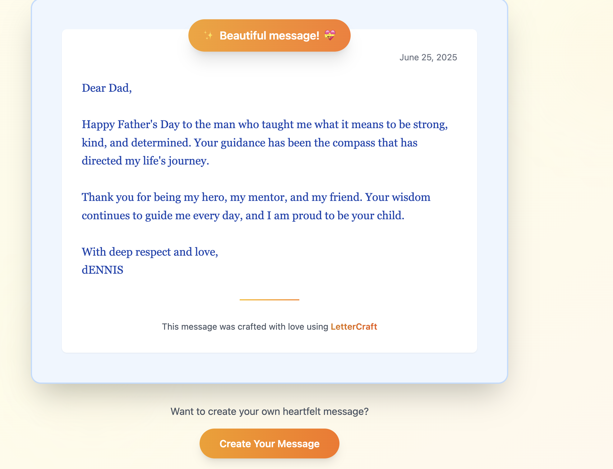 A tool to send heartfelt digital messages with AI-powered templates to loved ones for special occasions. Share them with magical celebrations that create unforgettable moments.