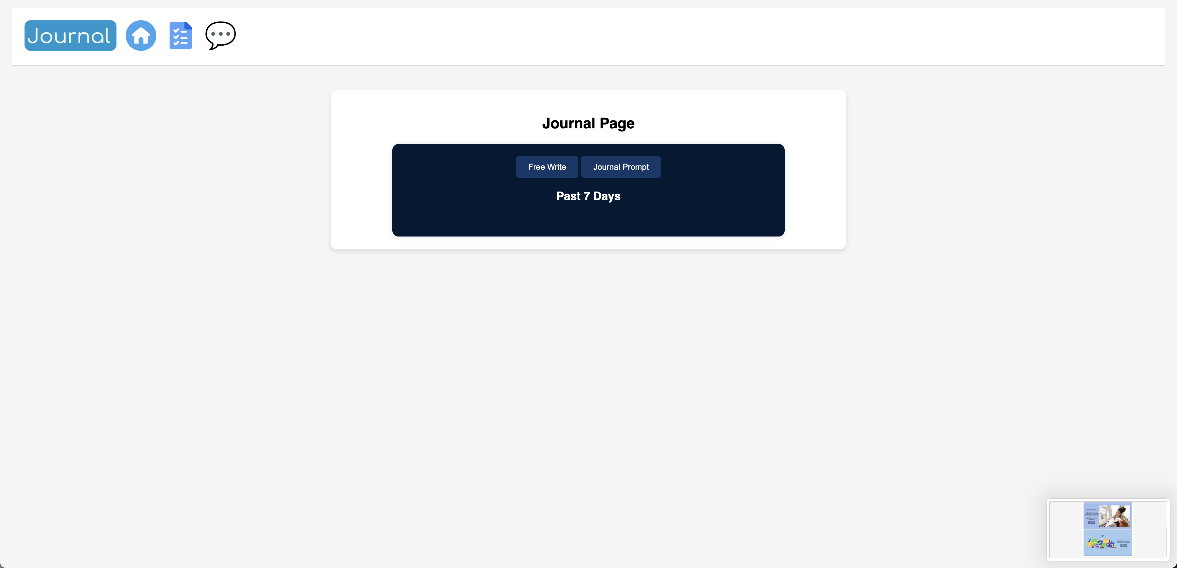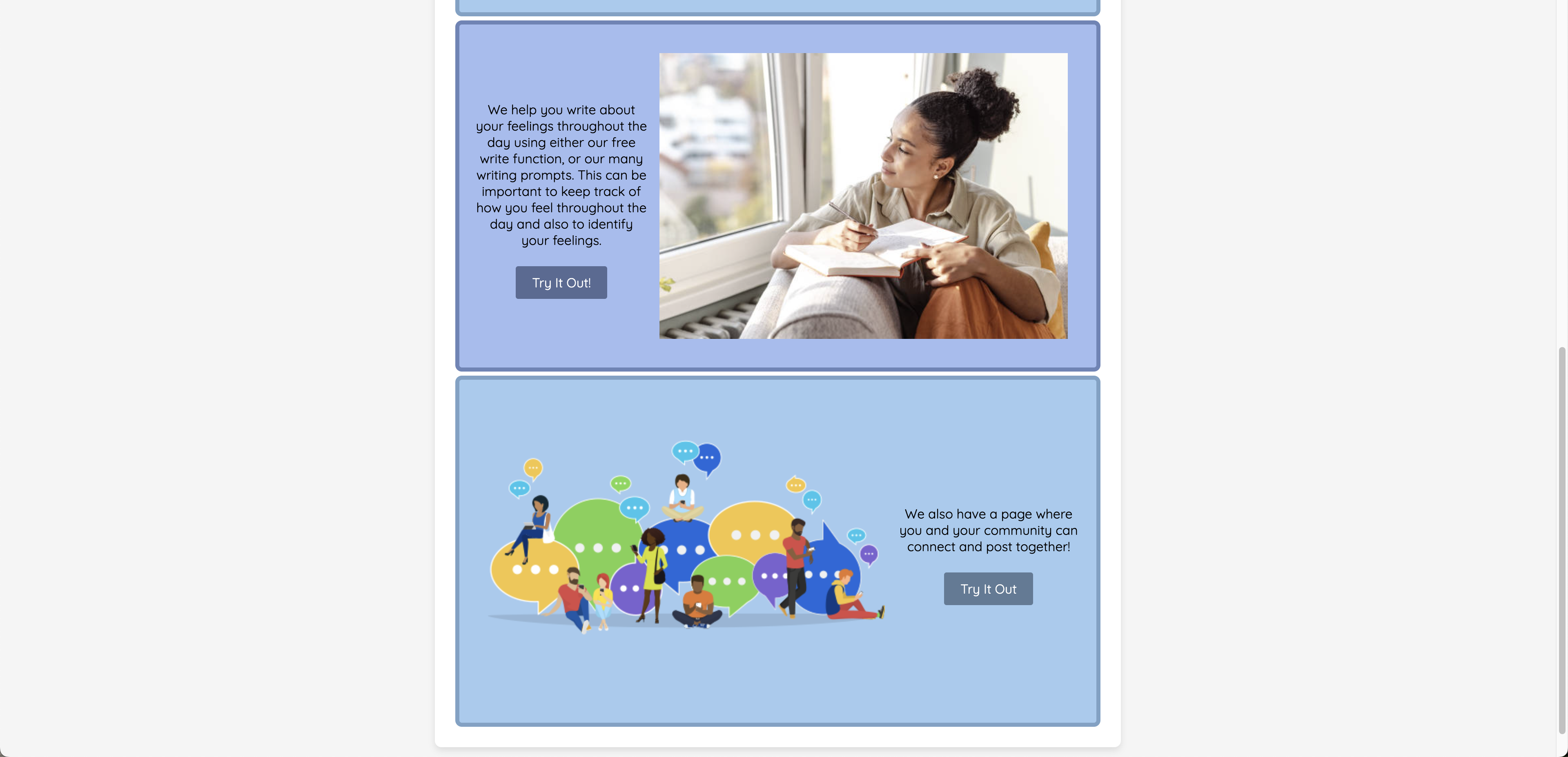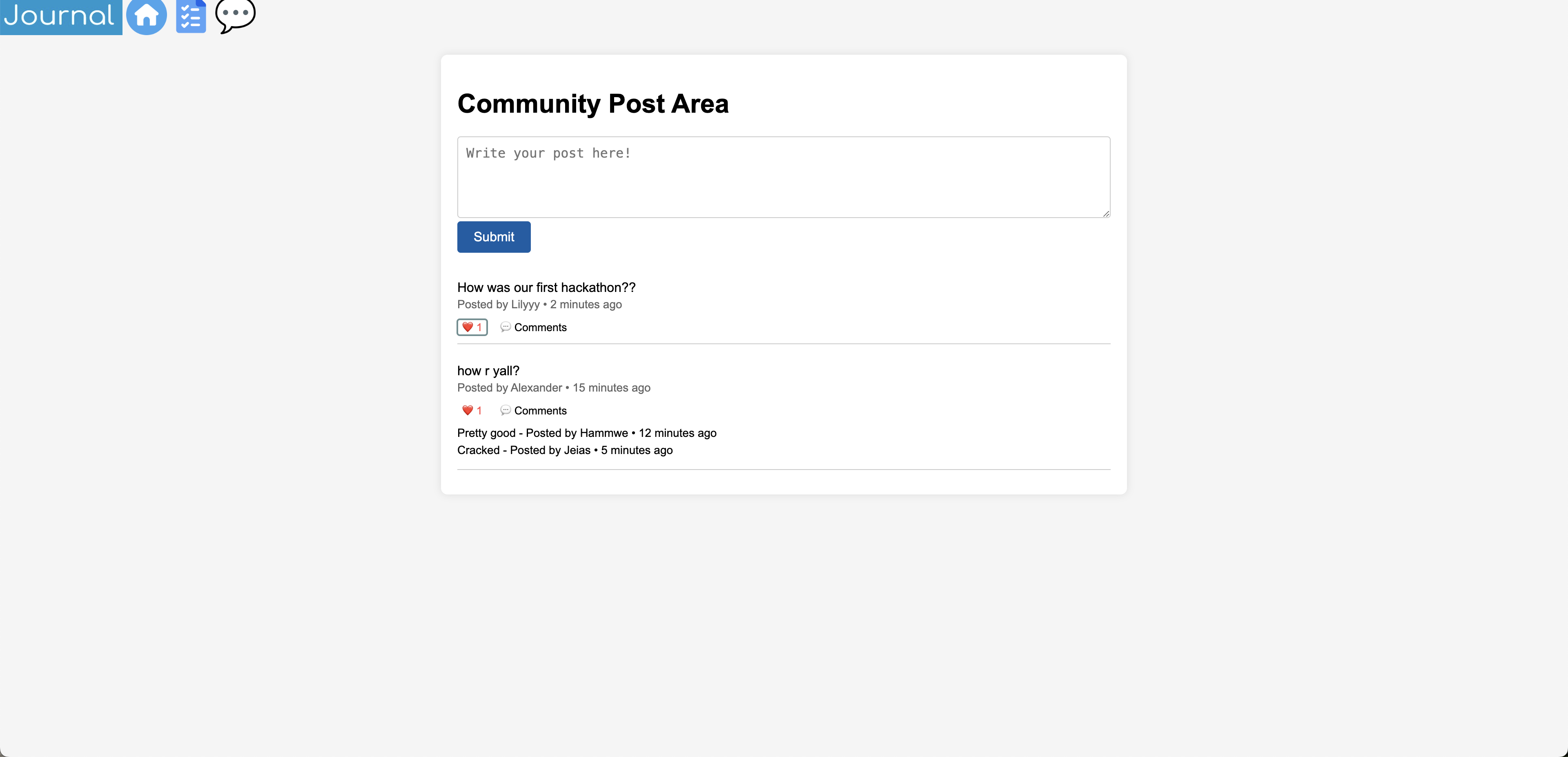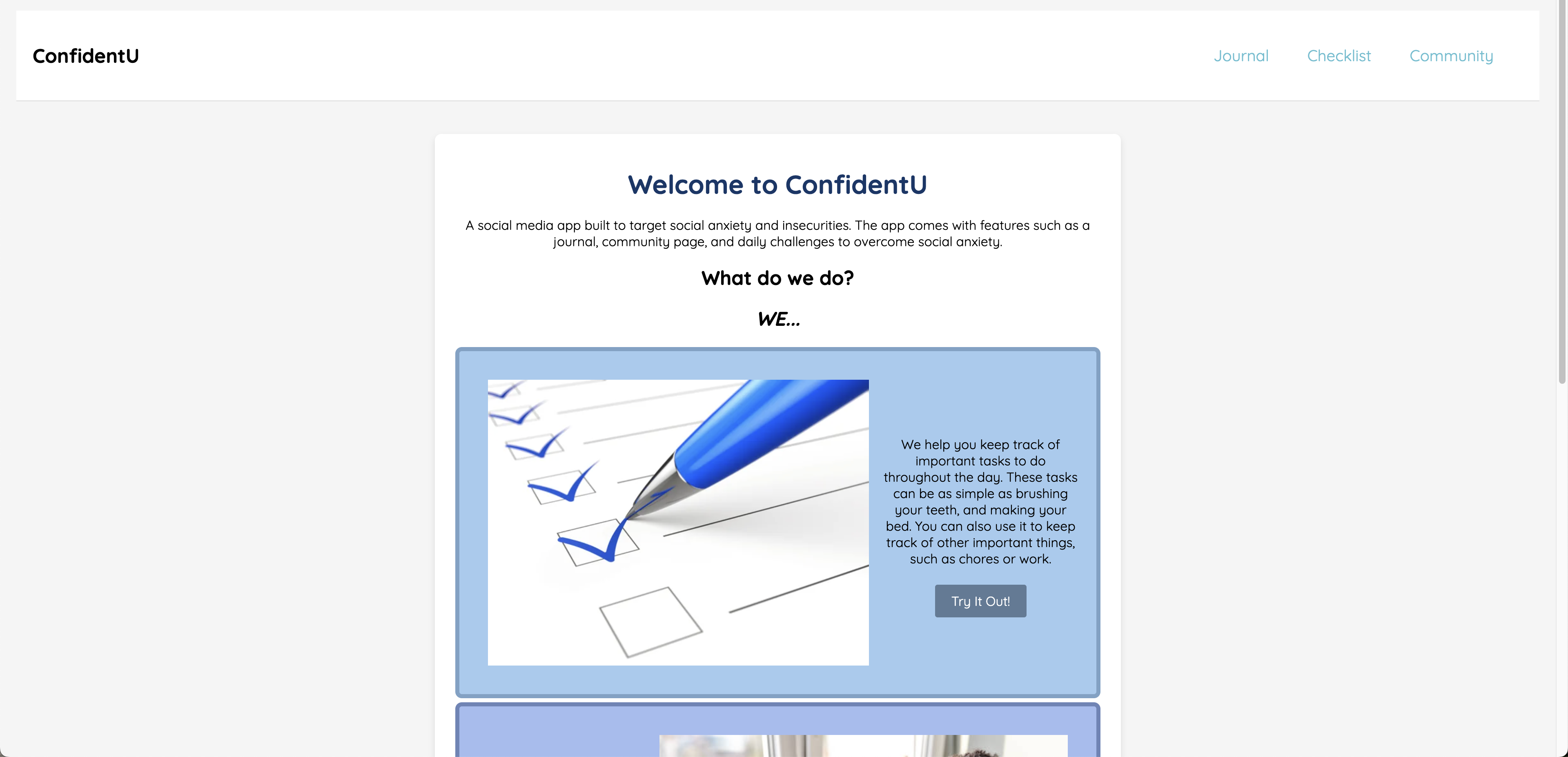 Our project can help people with mental health issues, such as depression, by making life a little easier for them. With our checklist feature, people can remember to do daily tasks, such as brushing their teeth or making their bed, boosting their motivation and energy. Using the free write feature and journal prompts, our journal feature can help to log and keep track of your emotions. We also have a community post feature, which allows users to connect with other people and meet like-minded individuals.