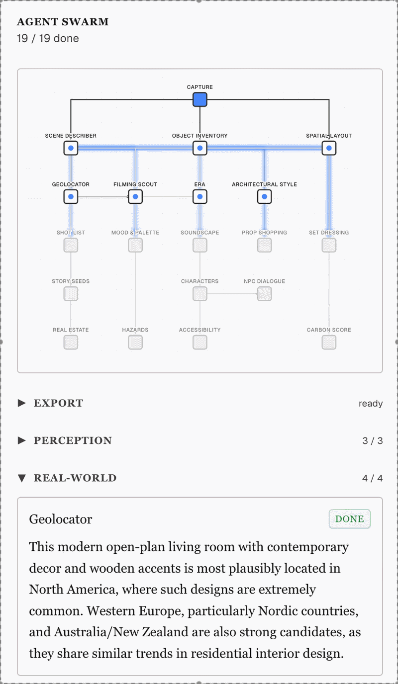 A key architectural decision was making each agent operate on the same canonical spec. That gave us deterministic handoffs and cleaner debugging: if something looked wrong visually, we could trace the exact section of the world spec that introduced it.