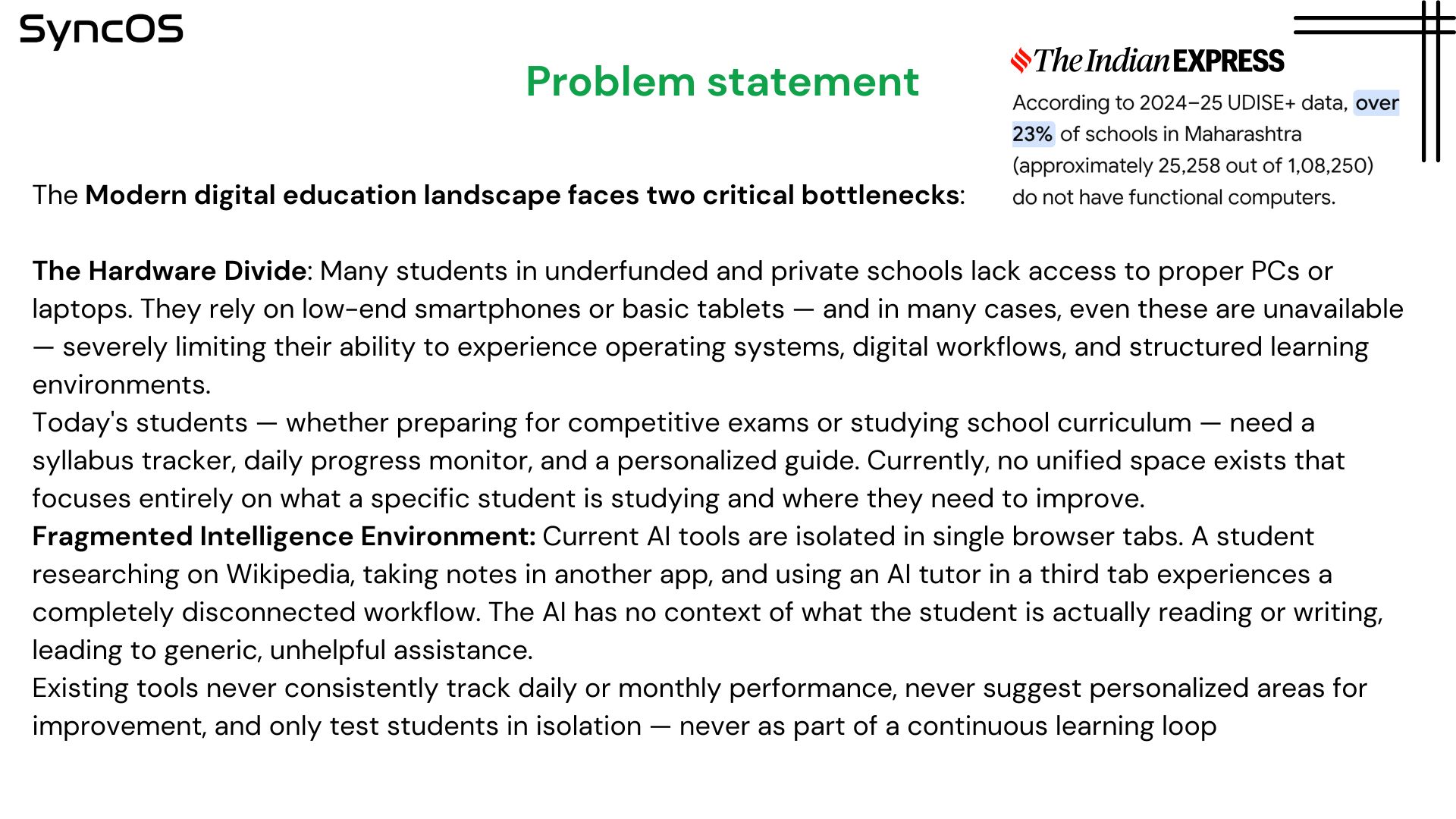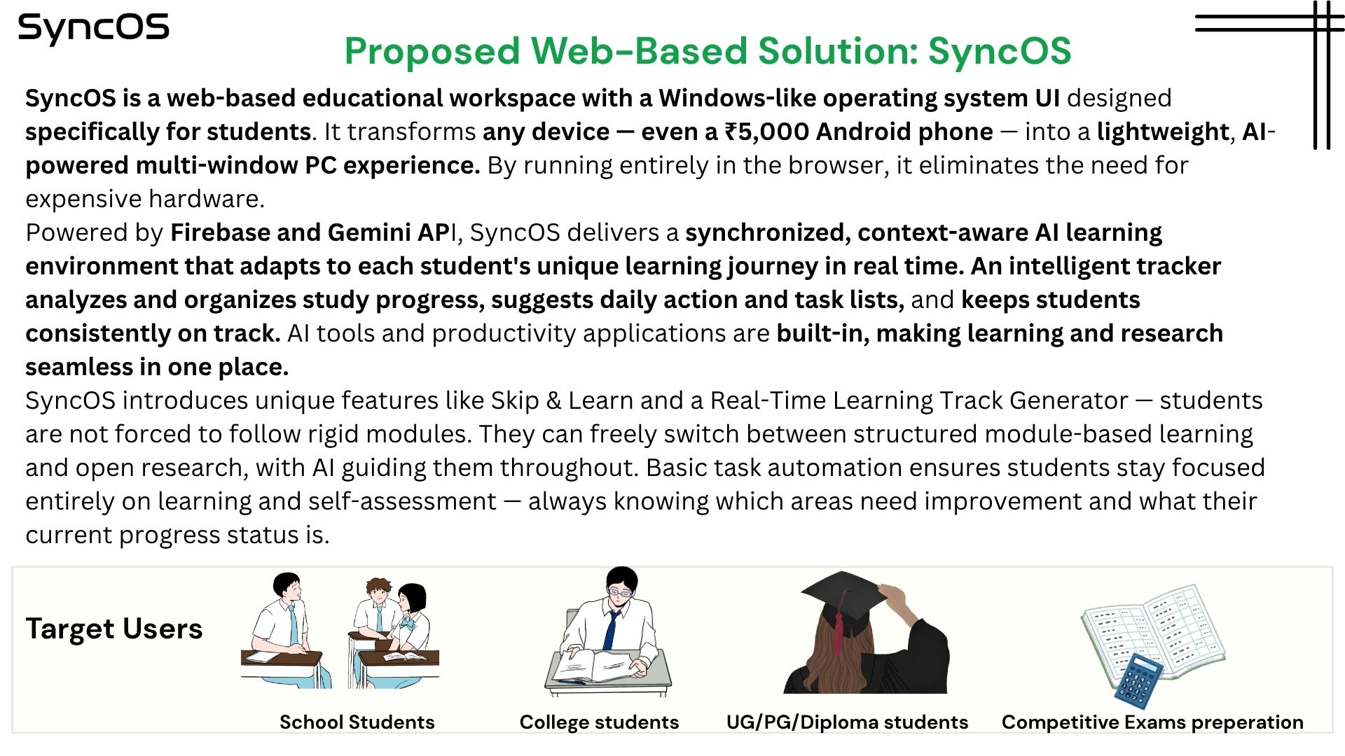 SyncOS aims to become a universal digital learning workspace that reduces dependency on expensive hardware and improves accessibility for students everywhere.