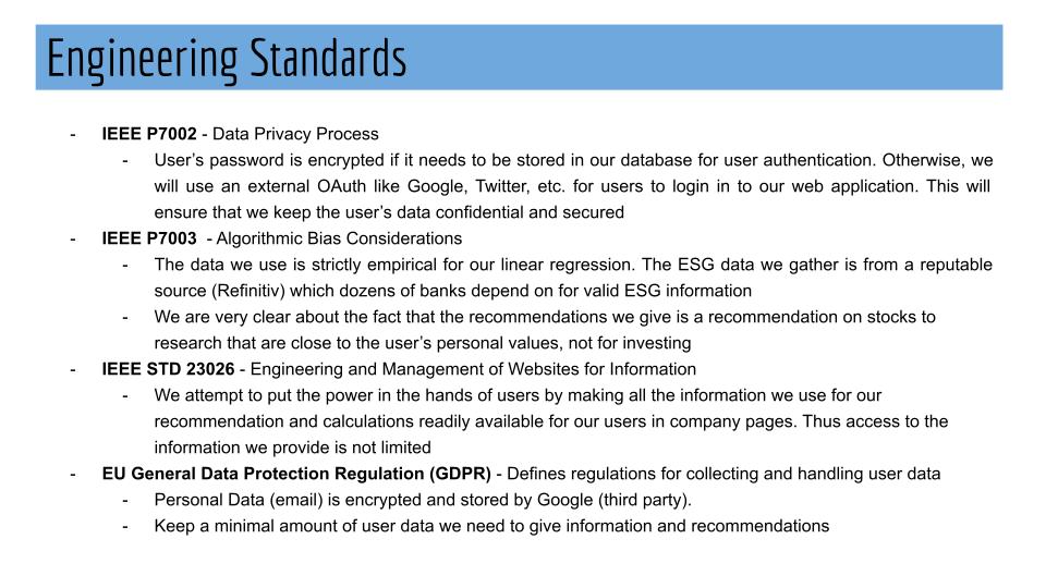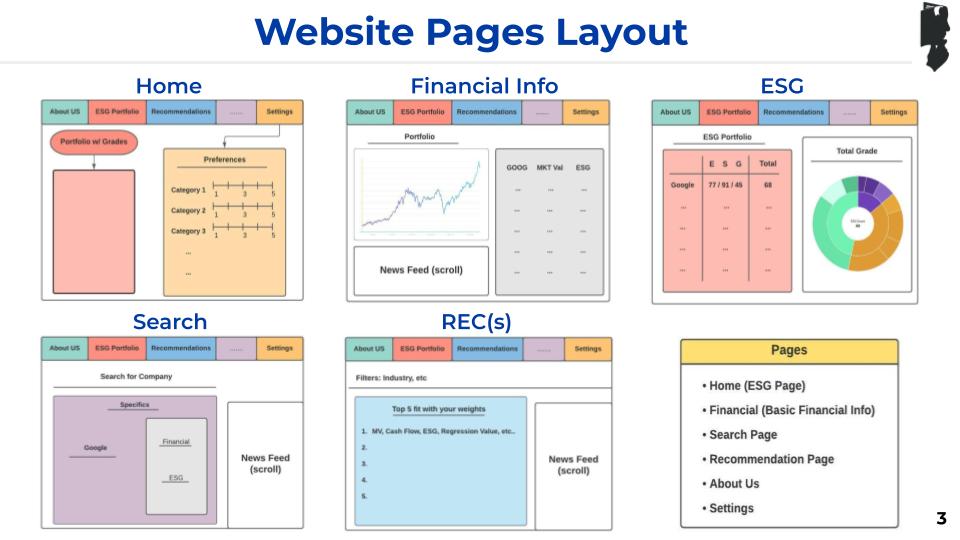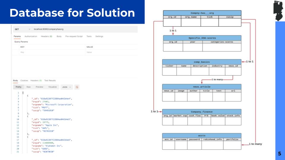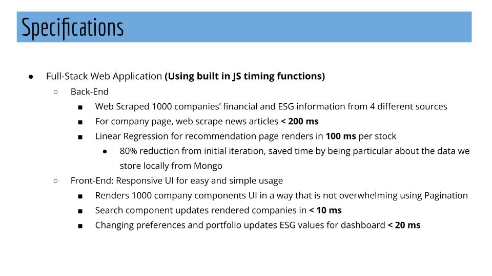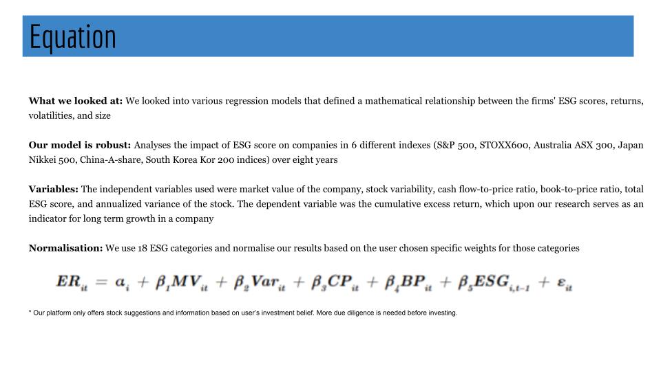 We aim to empower young retail investors today who don't have a way of evaluating their portfolios and getting recommendations on which stocks to invest in based on Environmental, Social, and Governance (ESG) metrics they care about. Our solution would help bring transparency to investing in companies and increase access to an intelligent tool that is customized per investor. Our tool would help customers consider ESG metrics in their investment strategy that often go unmeasured. Our solution will cater to investor-specific beliefs to help mitigate risks and provide a higher return on their investment. We also aim to influence companies to make more social, environment-friendly decisions. Our tool would be a web application which will have the following pages (Appendix 1): Home, Financial Info, ESG, Search and Recommendations. The way we will aim to make money through our project is through a freemium model where the recommendations on companies will be paid but the ESG health of the portfolio will be free.