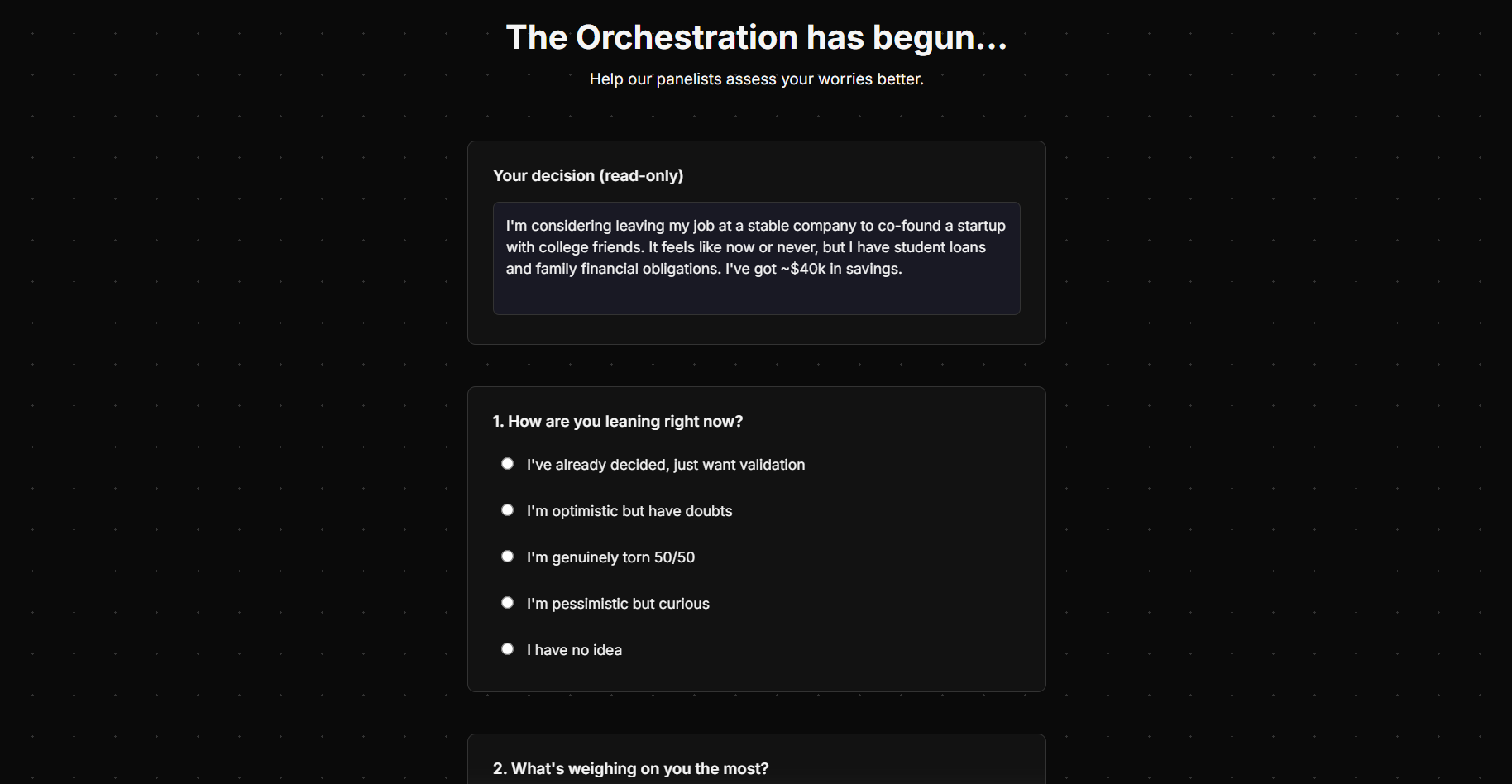 The inspiration for Consensus came from the realization that decision-making often benefits from diverse perspectives. However, accessing such perspectives in a structured, meaningful way is challenging. So I created a tool that could simulate this process, offering users clarity through orchestrated disagreement. Imagine convening a panel of diverse experts to debate your toughest dilemmas. Type in a juicy question (or use one of the sample prompts!) and witness all personas pull in opposite directions just to synthesize an insight together with the help of a moderator.