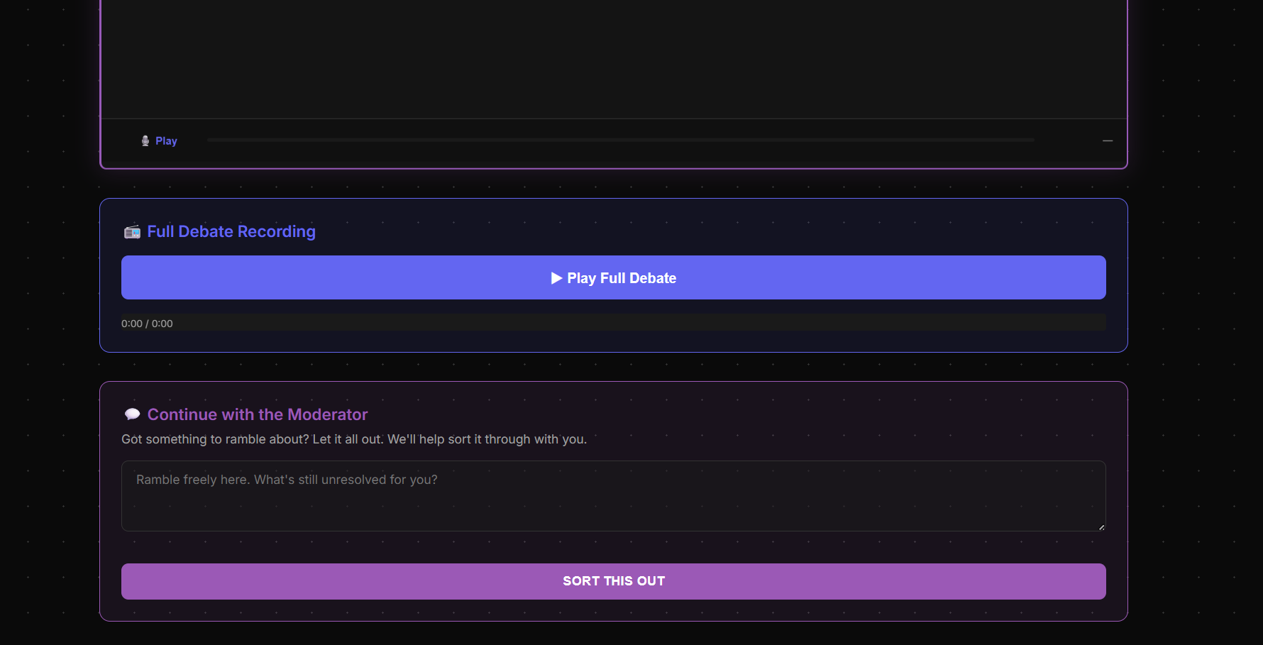 - Building a fully functional system that combines AI and audio technologies. Successfully integrating Google Gemini for persona-driven arguments and ElevenLabs for high-quality voice synthesis was a significant milestone.
