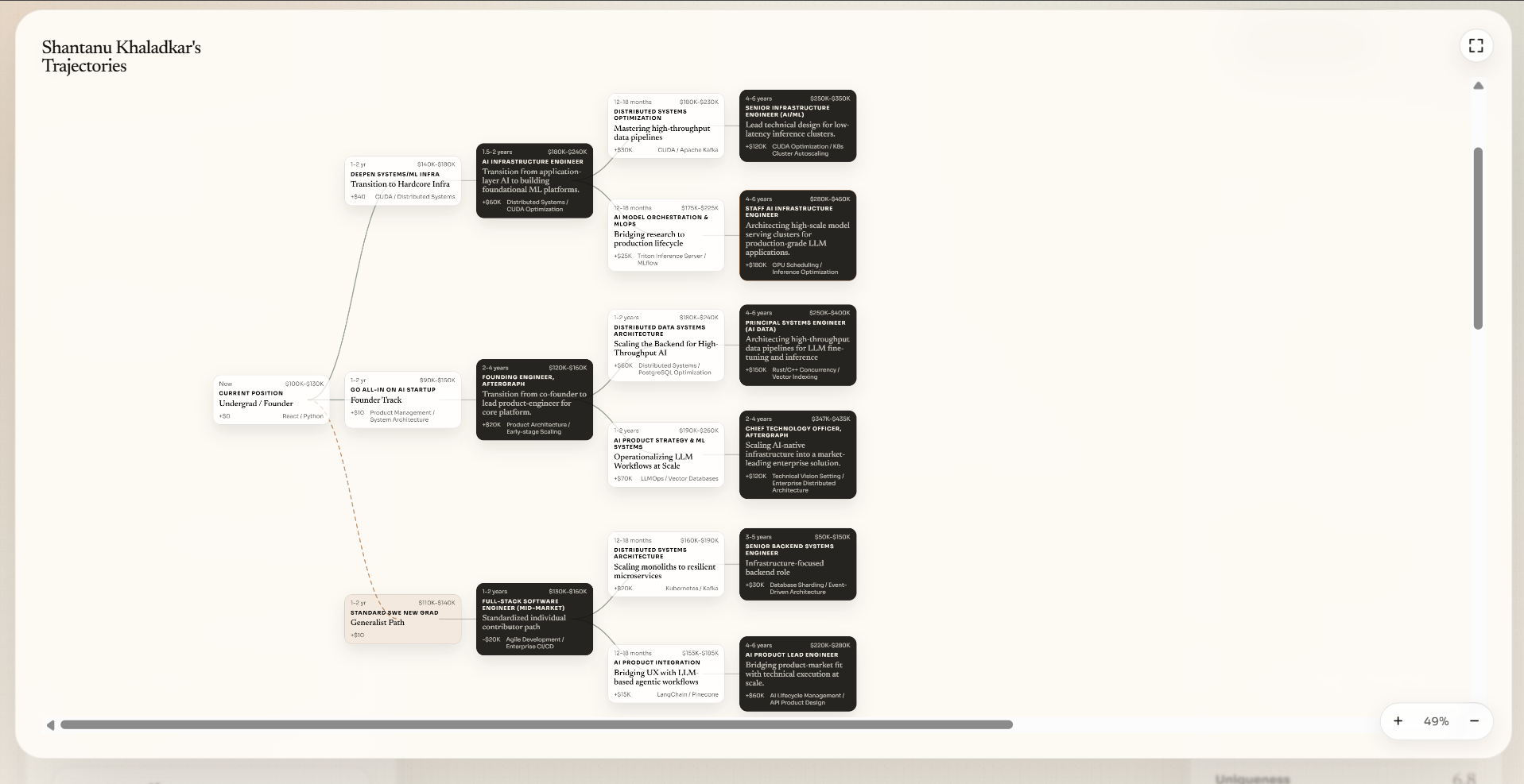Career planning is one of the most consequential decisions people in any community face, yet the tools available are surprisingly poor. Job seekers upload a resume to a portal, get a list of openings, and are left to guess which paths actually fit their trajectory. We wanted to answer a harder question: given who you are today, what are the realistic futures you could reach, and what would it take to get there? The idea was to turn a static document into a living, branching map of possibility -- something that makes the invisible structure of career mobility visible.