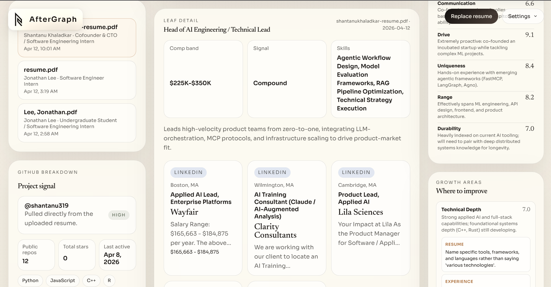 AfterGraph takes an uploaded resume (PDF, DOCX, or plain text) and produces a multi-layered career analysis: