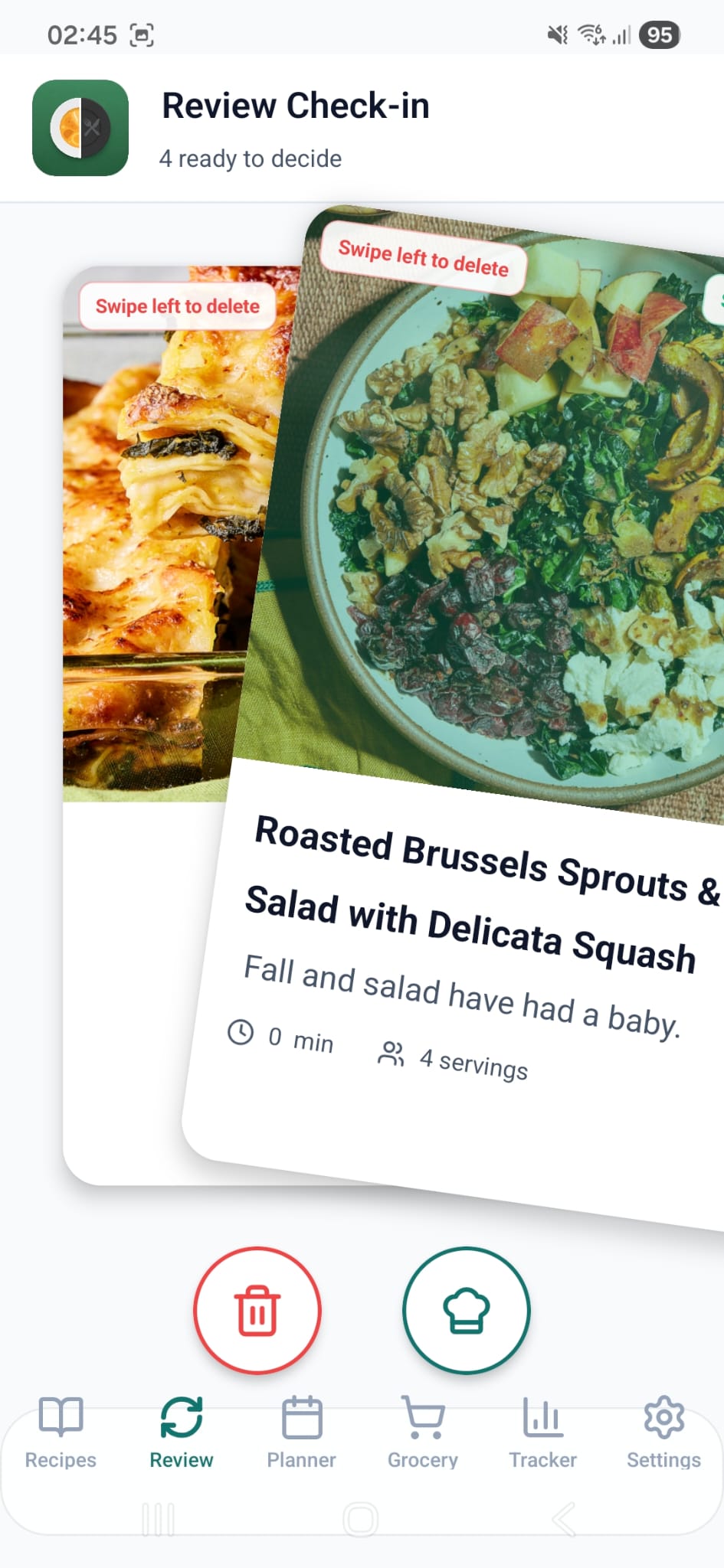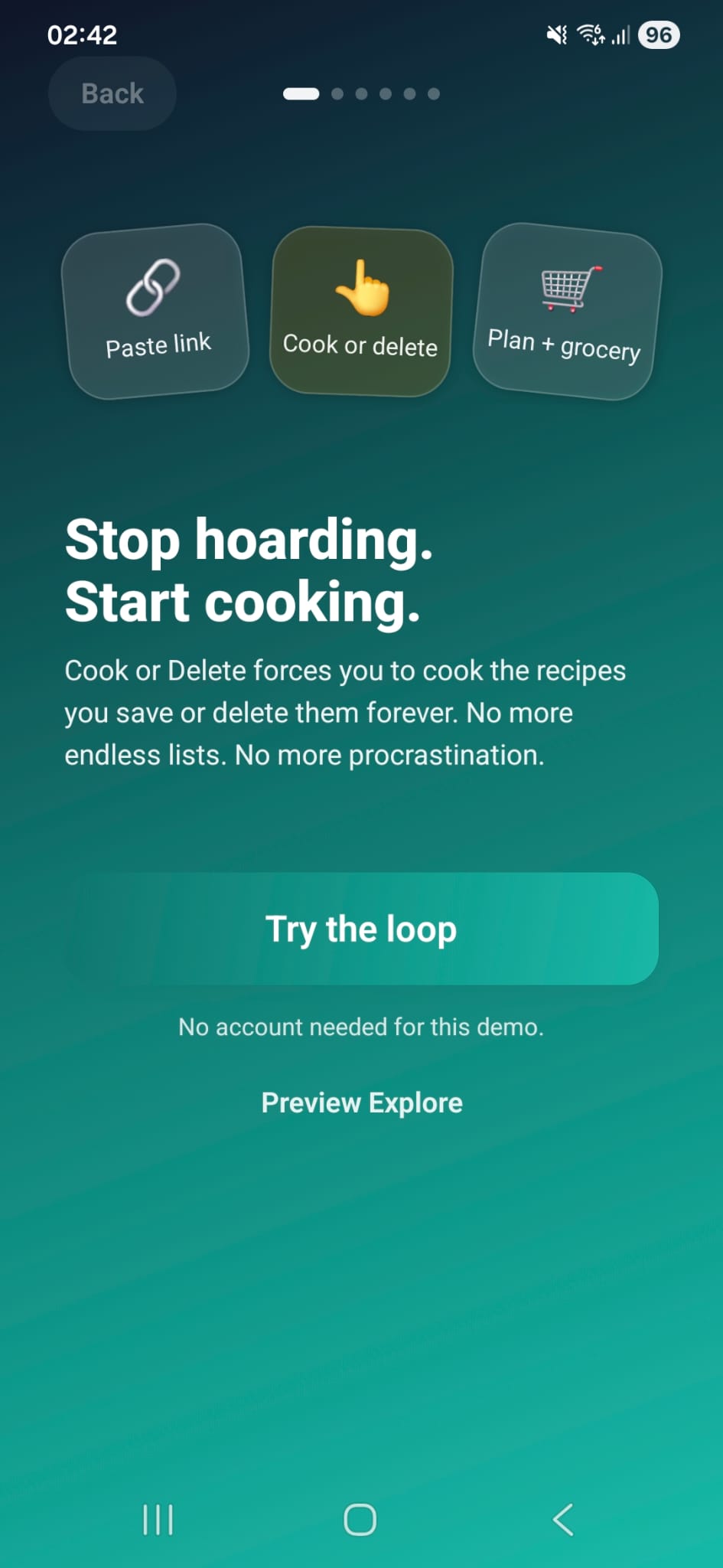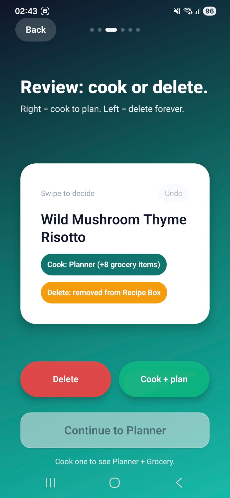 Users import recipes from links or social media into a simple inbox. Once per week, the app prompts them to make a decision for each recipe: cook it this week or delete it.