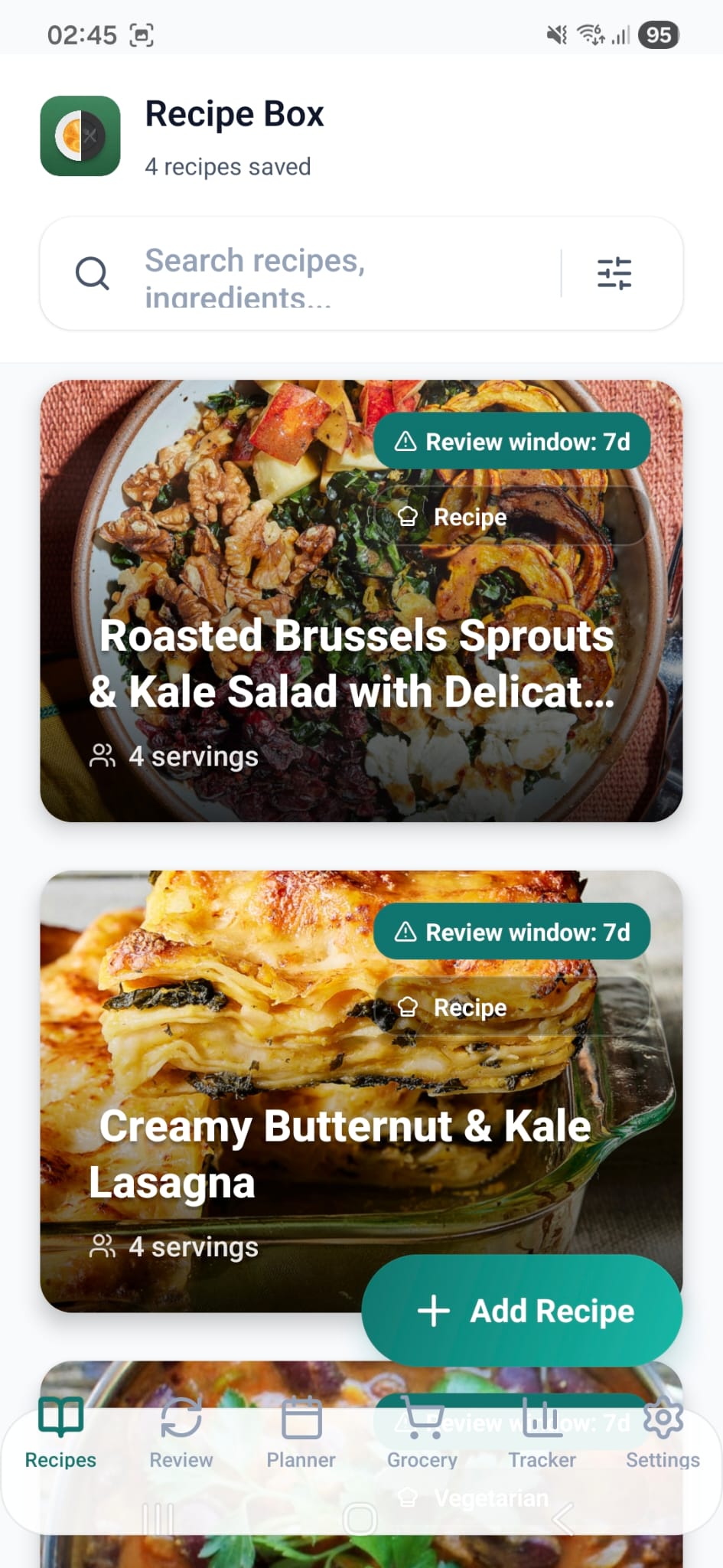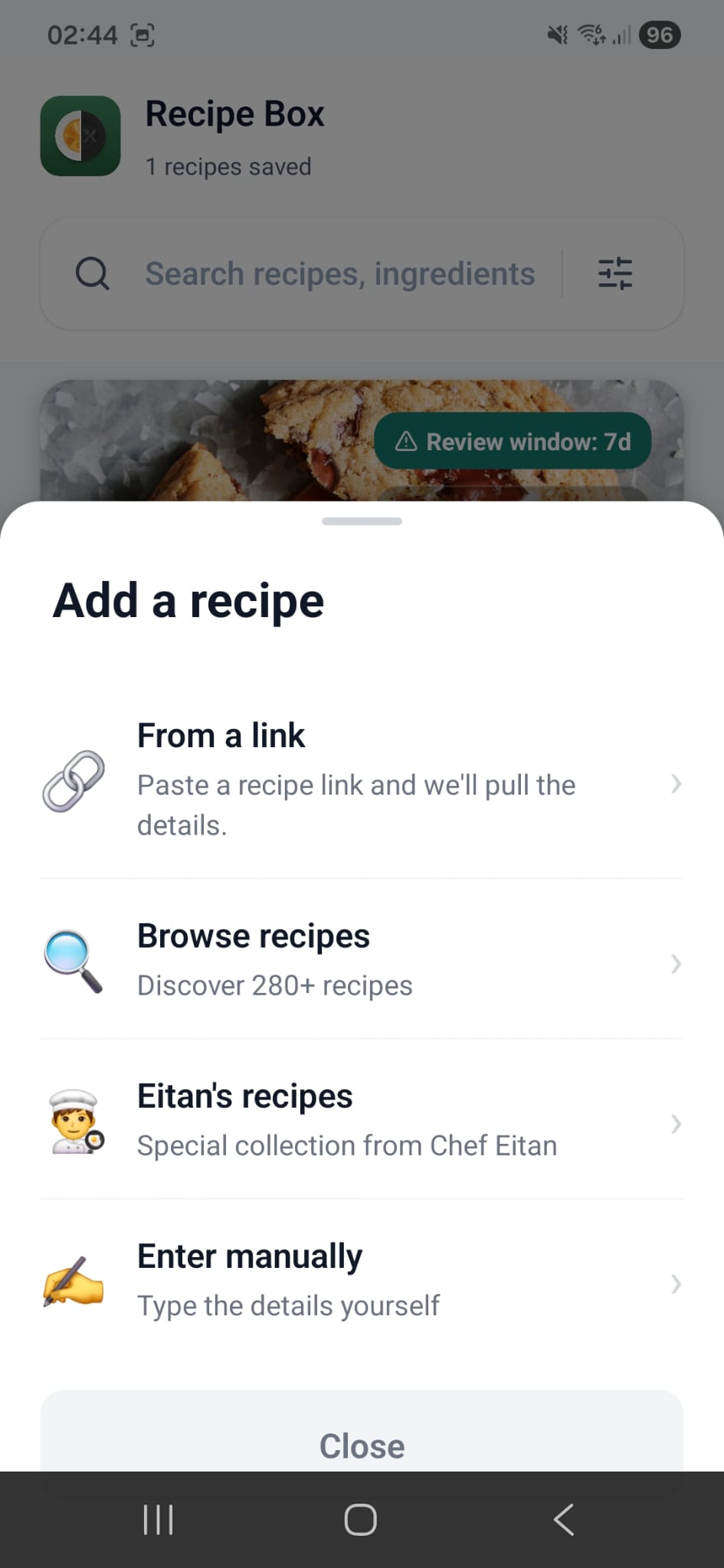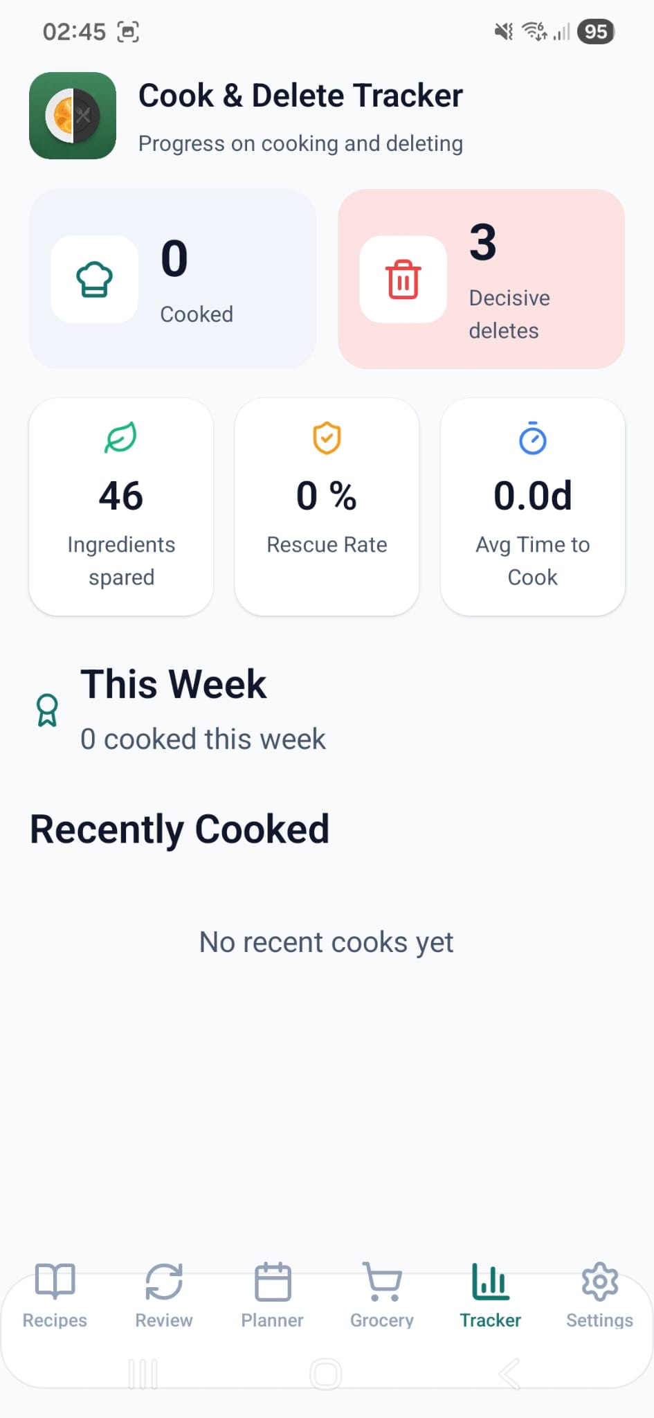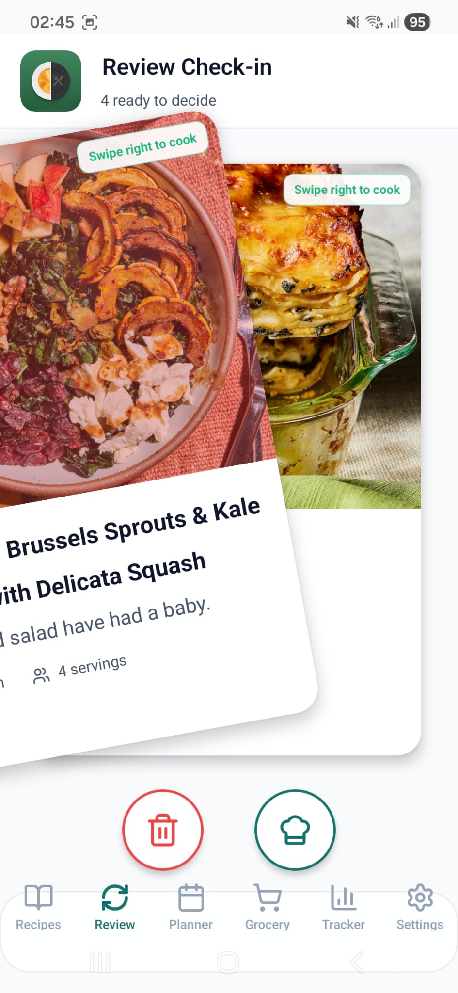 Users import recipes from links or social media into a simple inbox. Once per week, the app prompts them to make a decision for each recipe: cook it this week or delete it.