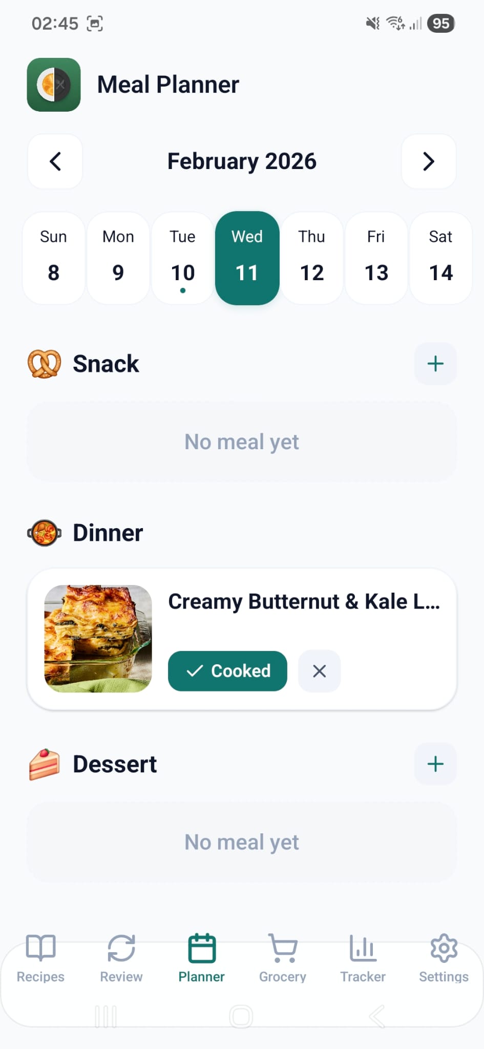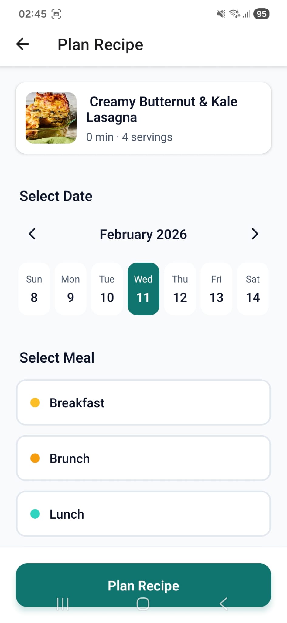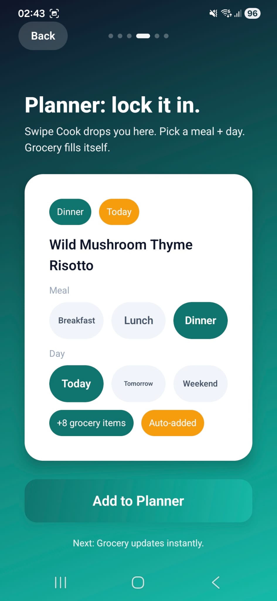 If they choose to cook, the recipe is scheduled on a specific day, added to a weekly plan, and included in a grocery list. Timely reminders nudge users to follow through.