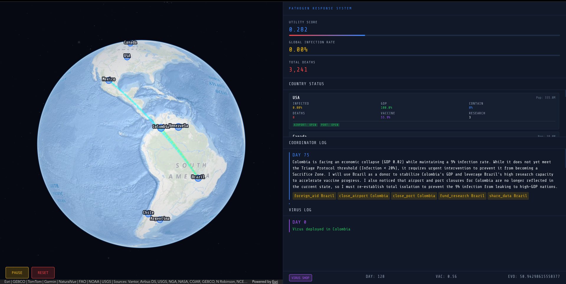 The backend is a FastAPI server hosted on Railway running an asyncio tick loop where 1 real second equals 1 simulated day. Each tick advances a custom SIR-based spread model across 8 country nodes with border modifiers, mutation mechanics, GDP decay, and vaccine progress. Every 5 ticks a Gemini-powered coordinator agent fires -- it receives a compressed world state as a markdown table, reasons using the ReAct pattern, and returns structured JSON tool calls that dispatch containment and research actions. The coordinator maintains conversation history across cycles so it can observe the effects of its previous decisions. The frontend is a single HTML file using the ArcGIS Maps SDK for JavaScript 5.0 to render a 3D SceneView globe with country nodes that change color and size based on live infection data streamed via SocketIO.