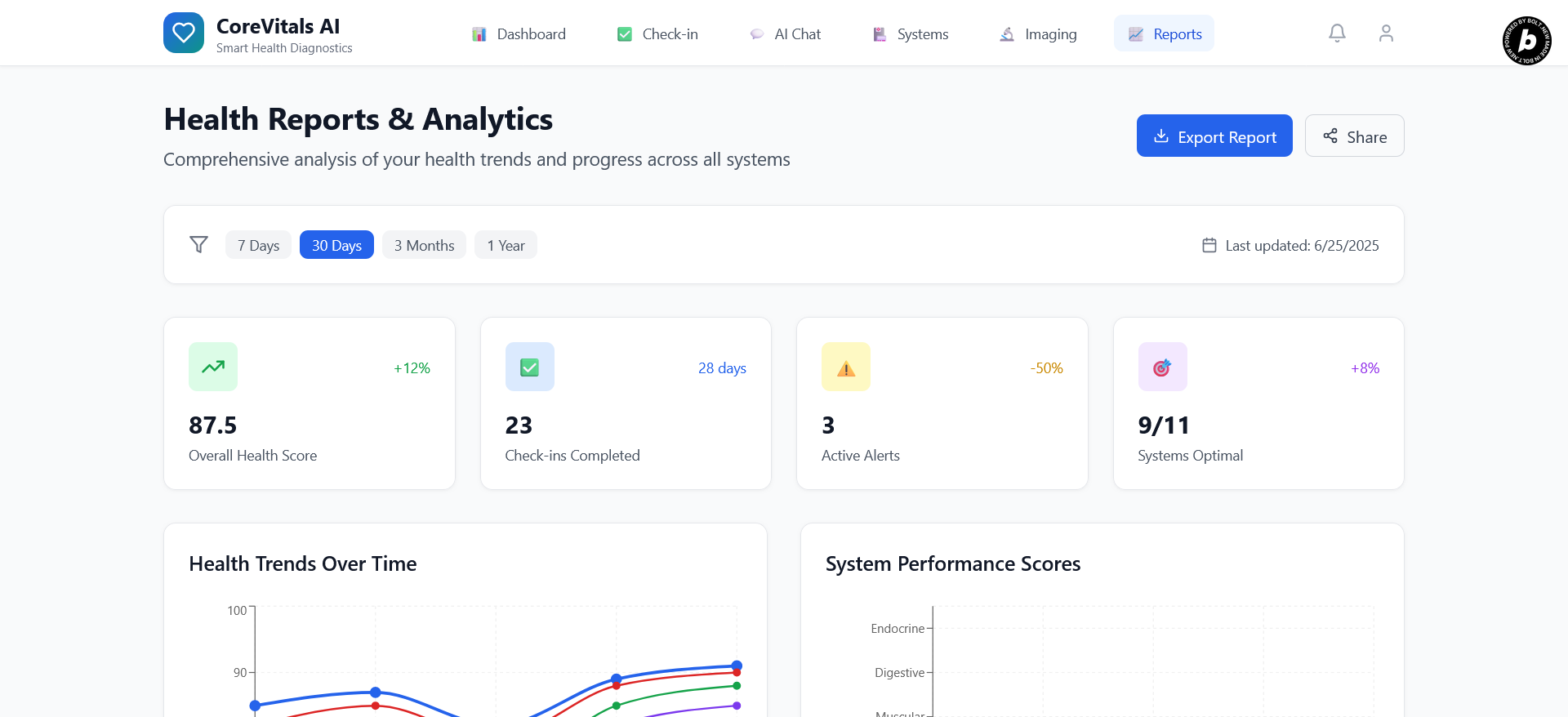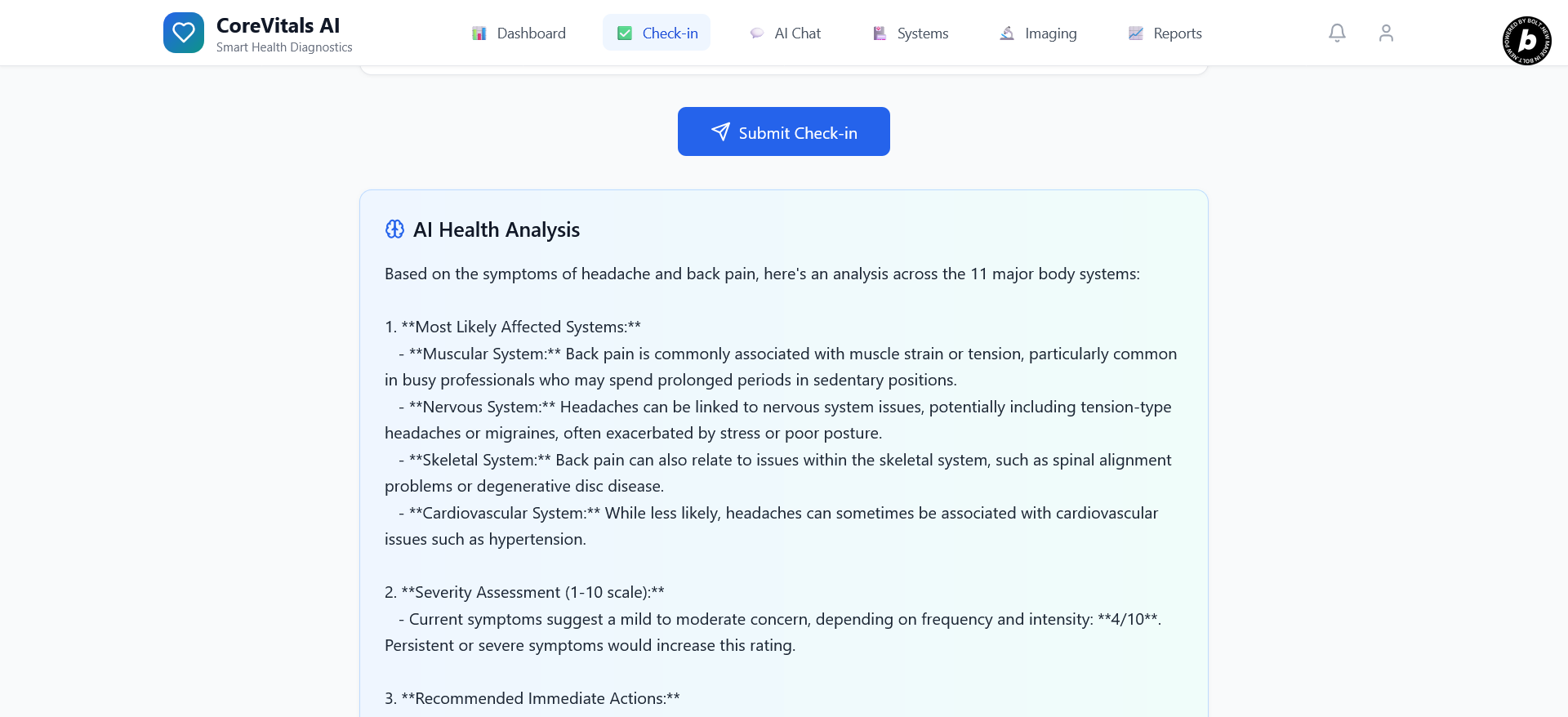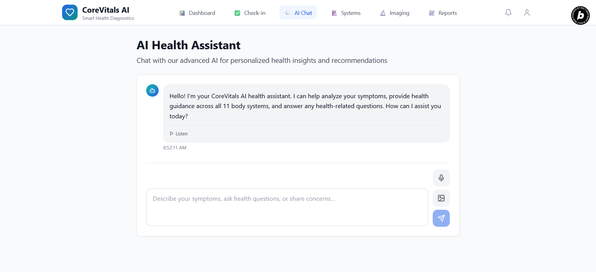 - AI Symptom Analyzer: Daily check-ins interpret your descriptions (text, voice, or images) to flag early warnings across all 11 body systems.