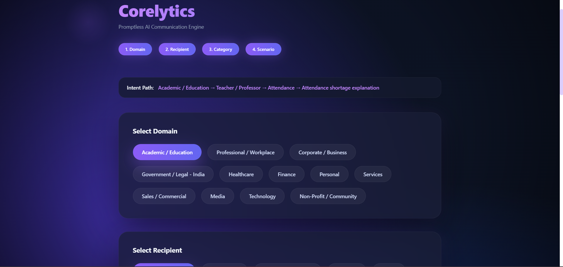 UI – Recipient + Category Step 2 & 3: Recipient and category refine communication intent and automatically adjust tone and structure.