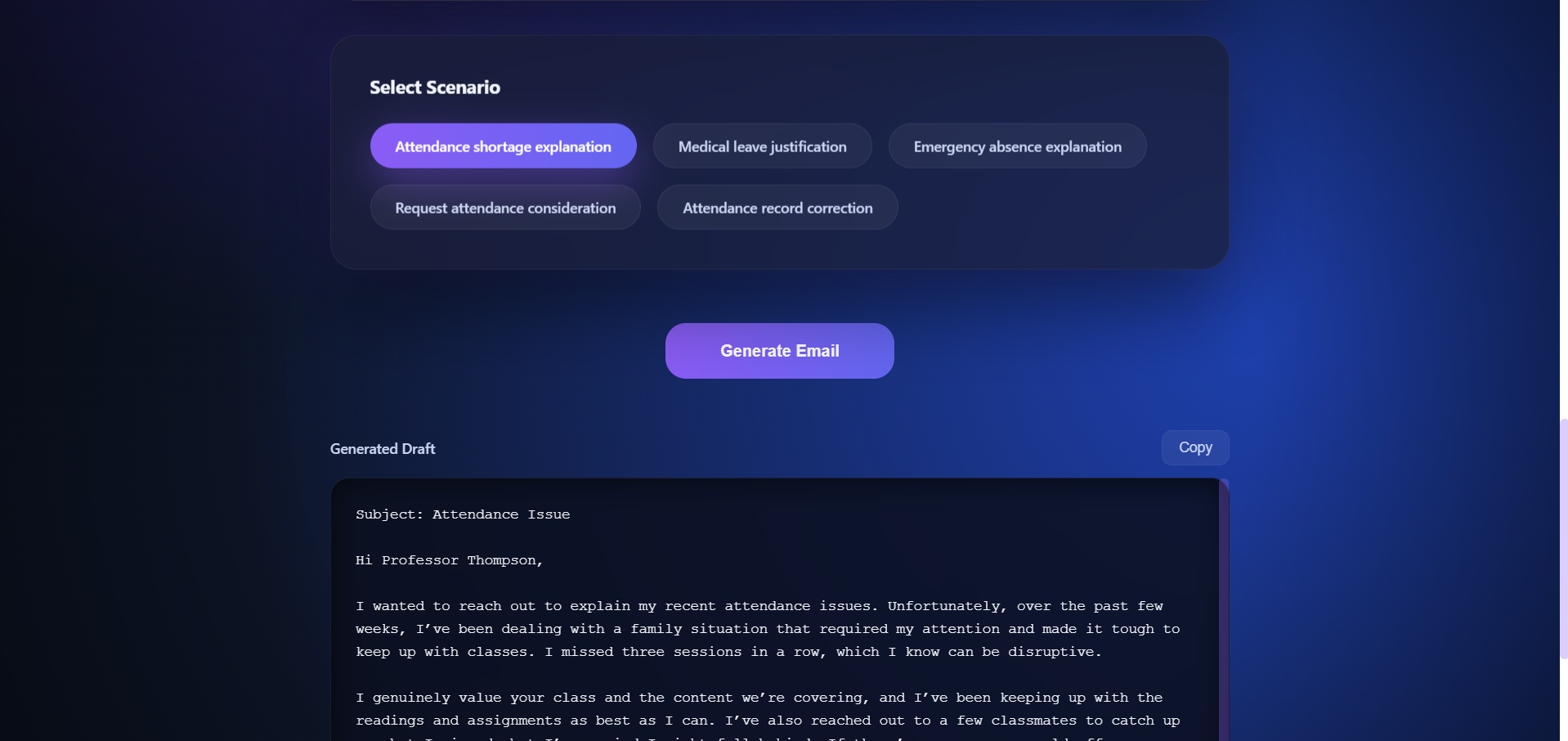Based on these selections, the system automatically constructs the required context and generates a professional, ready-to-use email.