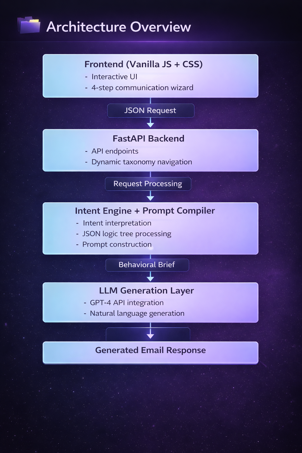 Architecture Overview End-to-end pipeline: UI → FastAPI backend → intent engine → prompt compiler → LLM → structured email output.