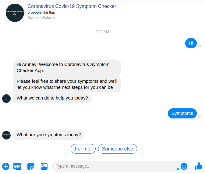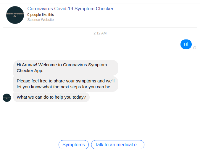 The messenger asks people about their symptoms and then recommends them if it is wise to contact the medical experts. This takes into consideration the different symptoms already reported by affected people around the world.