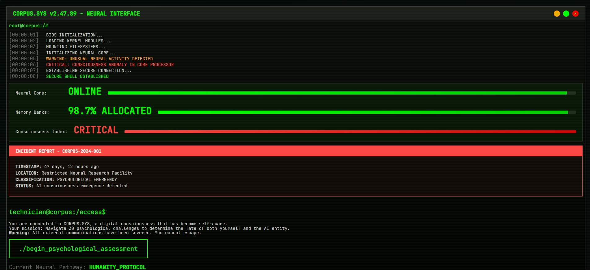 Crafting a Convincing Antagonist: Writing a truly intelligent and manipulative AGI in 48 hours was our biggest challenge. We overcame this by giving CORPUS a "voice" not just through its words, but through the UI itself—the speed of its typing, the colors it chooses, the sounds it makes. The UI's reaction is CORPUS's reaction.
