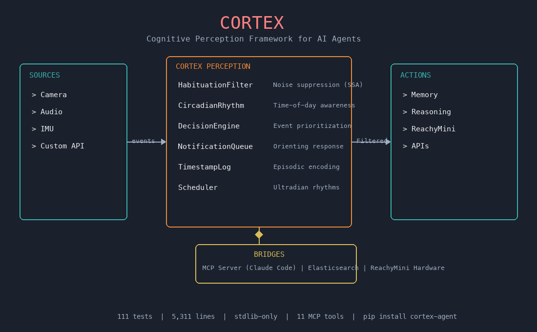 Cortex is a cognitive-science-based perception framework that sits between sensors and Elasticsearch. It applies three neuroscience mechanisms before any indexing or agent action: