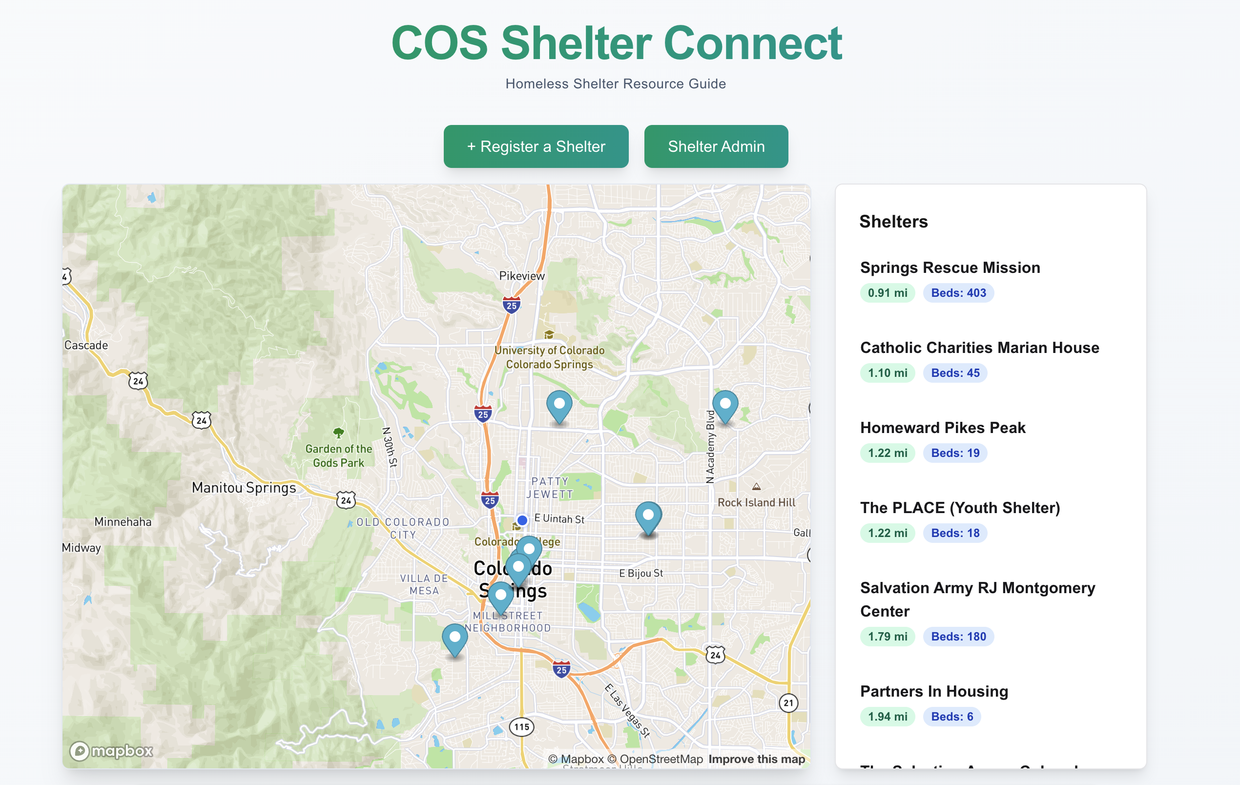 Homelessness is complex issue that directly affects thousands of members of our community in Colorado Springs. The resources are very limited for addressing shelter needs and little technological innovation is directed towards these communities that don't provide profit incentives. Our project hopes to streamline shelter management for social workers allowing them to spend more time on face to face support. Additionally our project hopes to make it easier for unhoused individuals to find shelters that fit their needs.