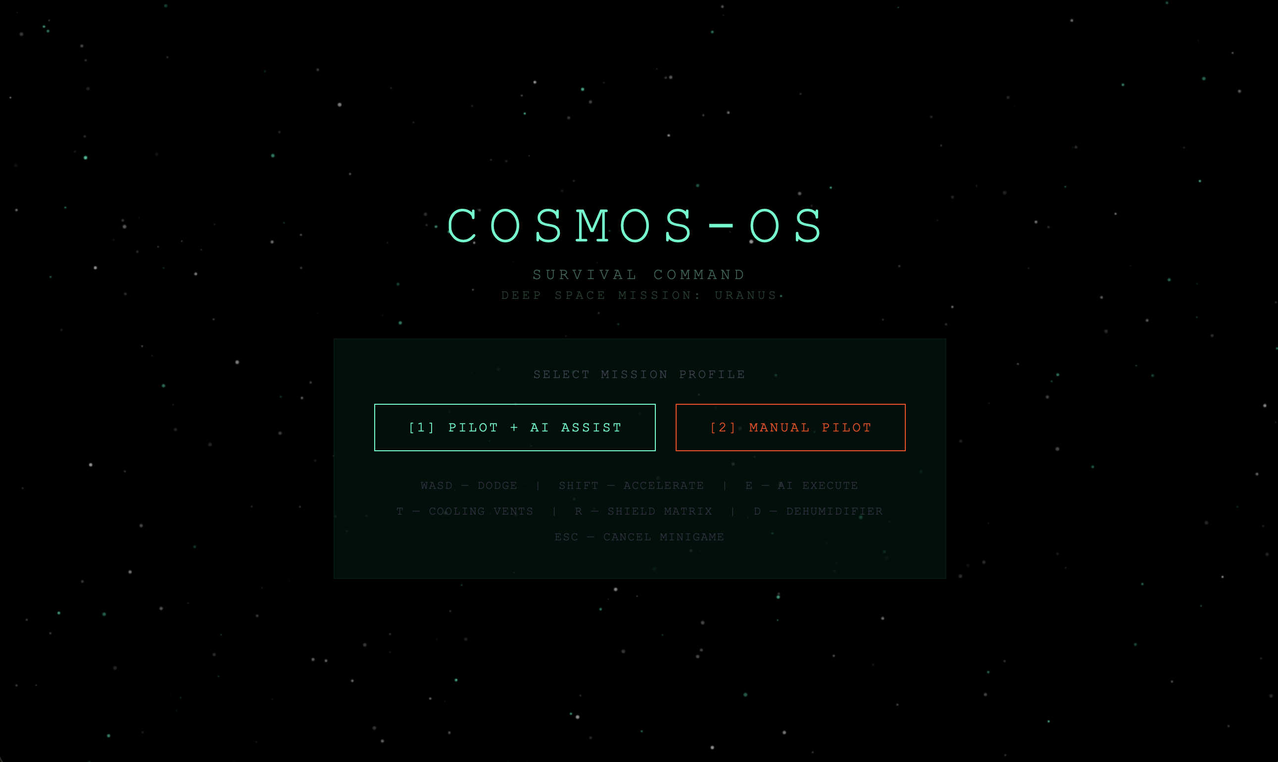COSMOS-OS is a real-time spacecraft systems simulator with a live AI co-pilot. You manage five critical onboard systems — hull integrity, thermal load, oxygen, radiation, and atmospheric humidity — all degrading simultaneously as you navigate asteroid fields and alien encounters. The onboard AI runs a predictive risk model every frame, projecting system states three seconds into the future and alerting you to the highest-priority threat before it becomes a crisis. When a system goes critical, you don't just press a button , you execute a hands-on repair minigame that scales in difficulty based on how bad things already are. A thermal overload at 120°C gives you a faster needle, a narrower target zone, and less time than one at 70°C. Every decision has a downstream consequence on another system. It's a functional proof-of-concept for how transparent AI advisory systems could work aboard real spacecraft, where human override always remains the final word.