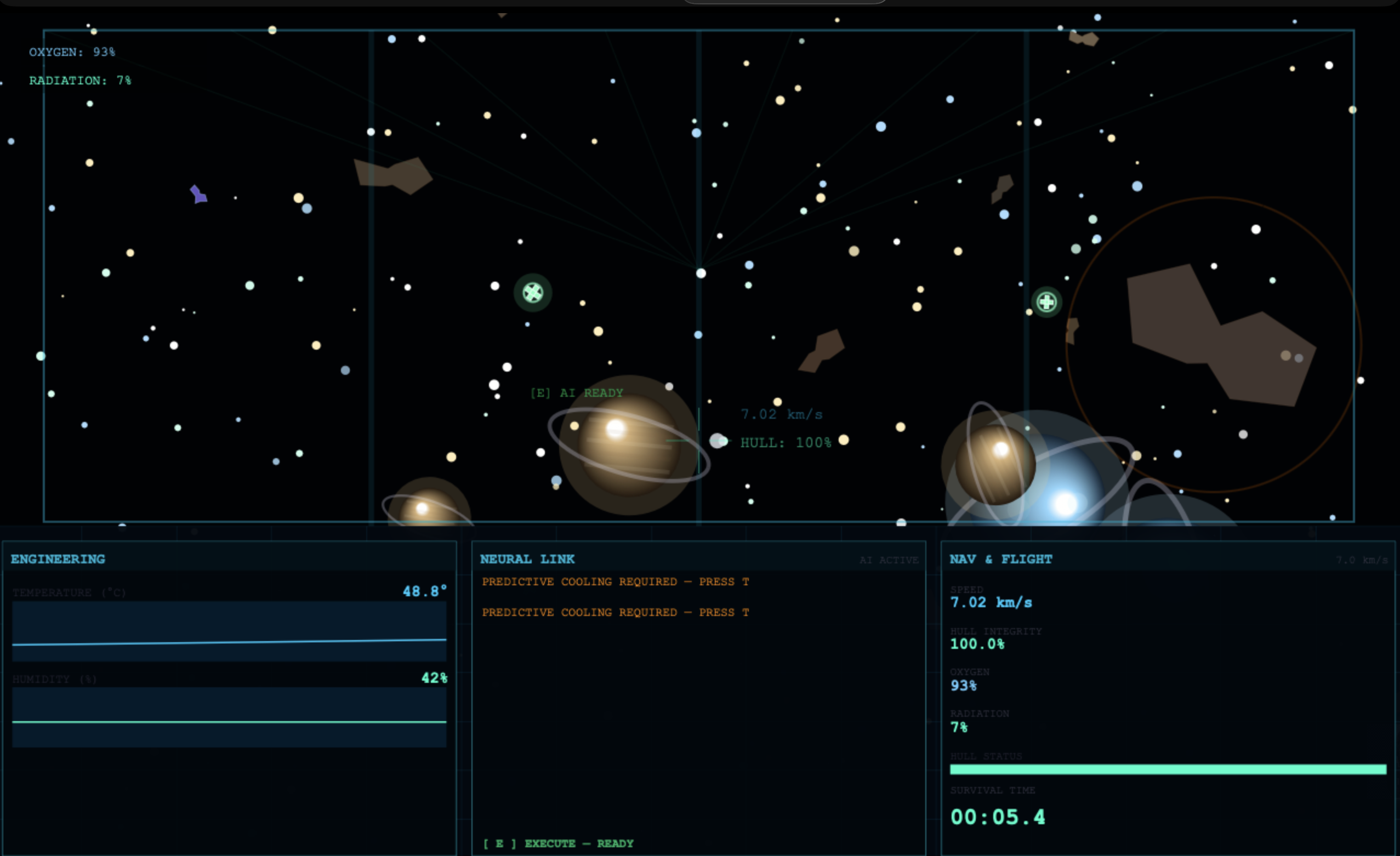 Building a complete, playable, polished game with reactive AI, procedural audio, five interlocking systems, minigames, alien encounters, health pickups, and particle effects in a single hackathon. The predictive AI model genuinely works: it catches compound failure chains before they happen and gives advice that, if followed, meaningfully extends survival time.