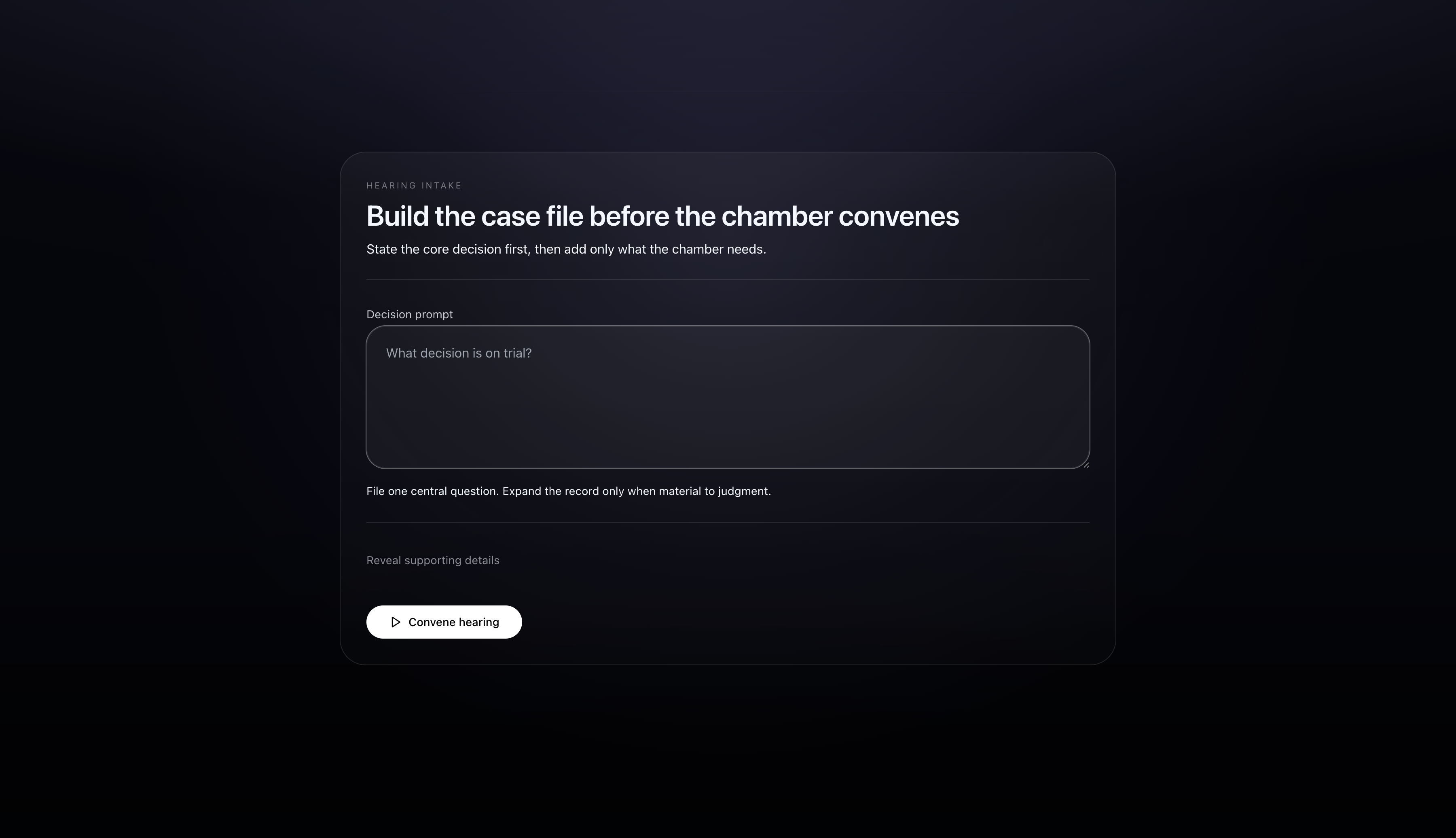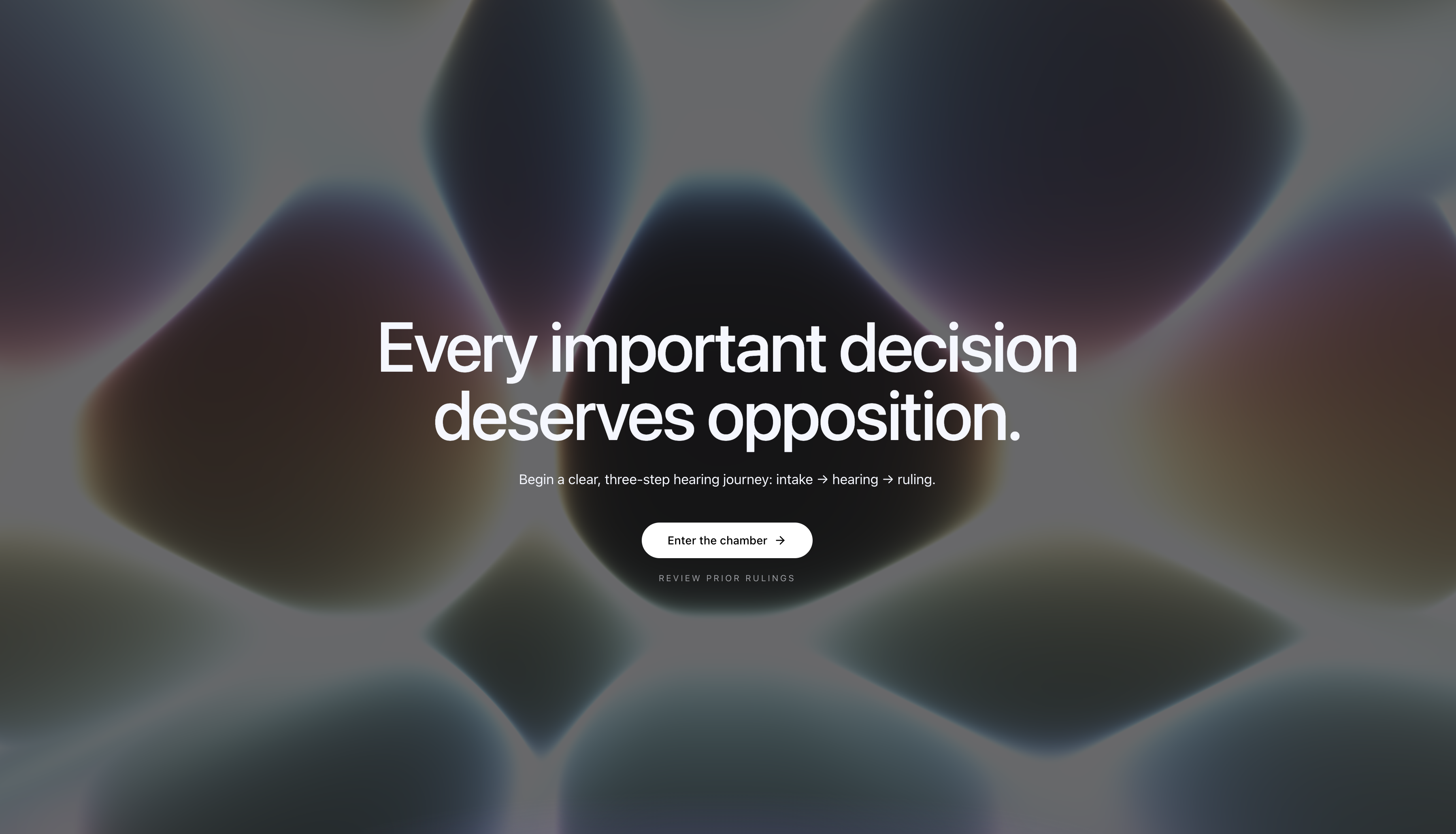 Home page A startup-style landing page that introduces the product and establishes the tone. Input page A focused page where the user enters their dilemma and supporting context. Chamber page The live hearing experience, where the AI counselors respond in sequence. Results page A separate page that displays the final ruling, rationale, and next action. Frontend