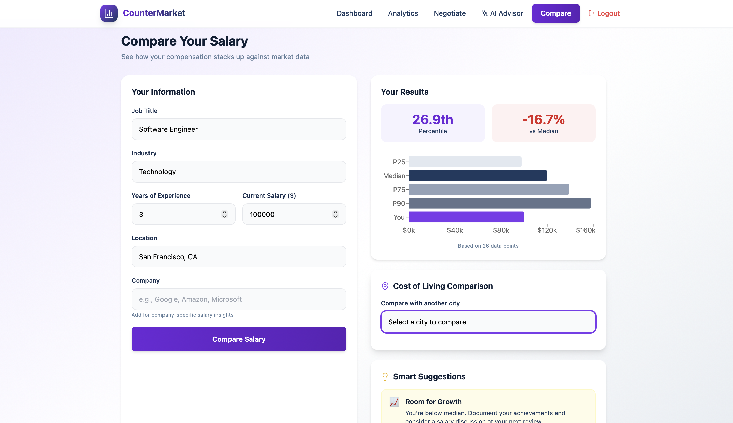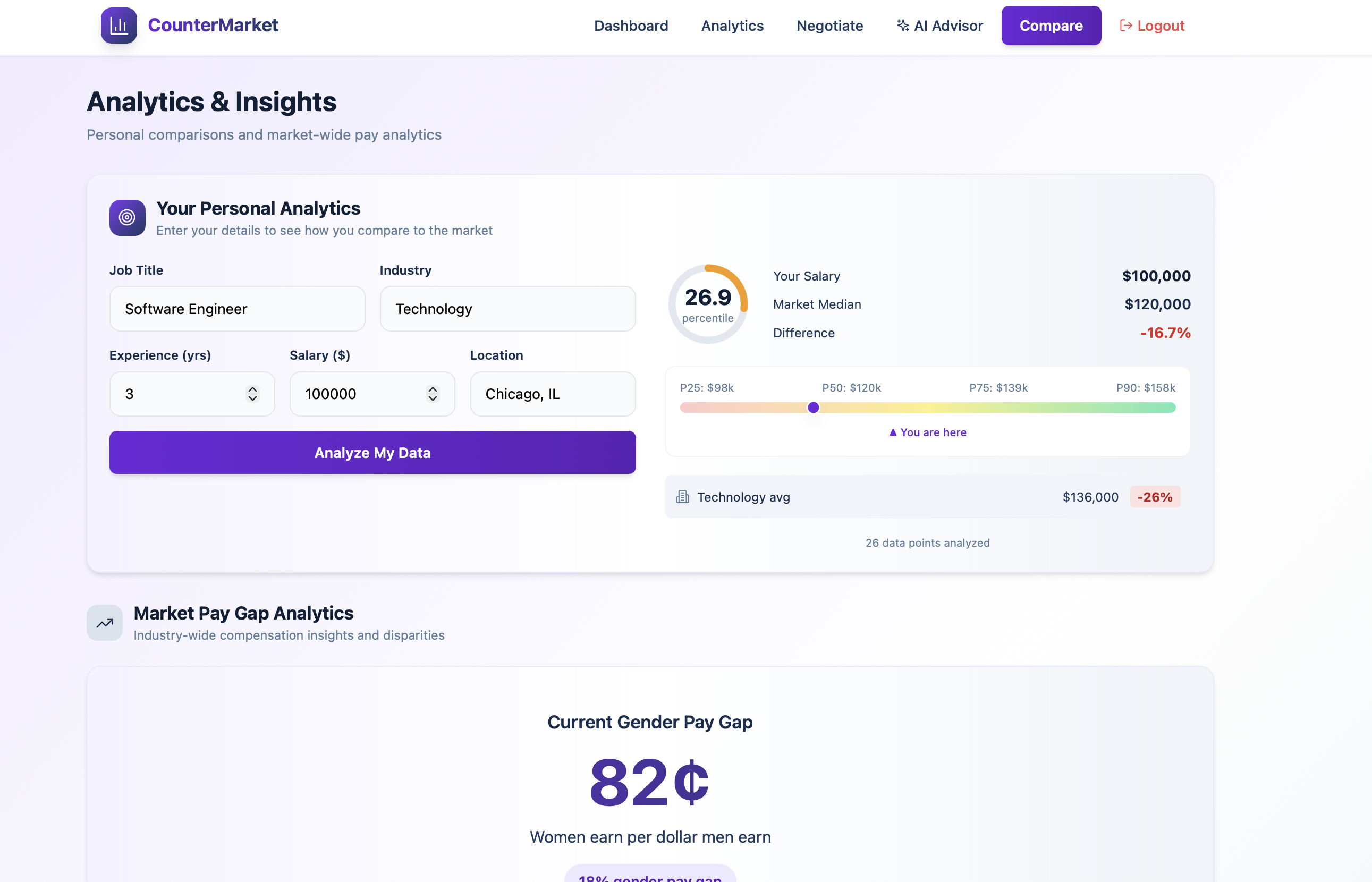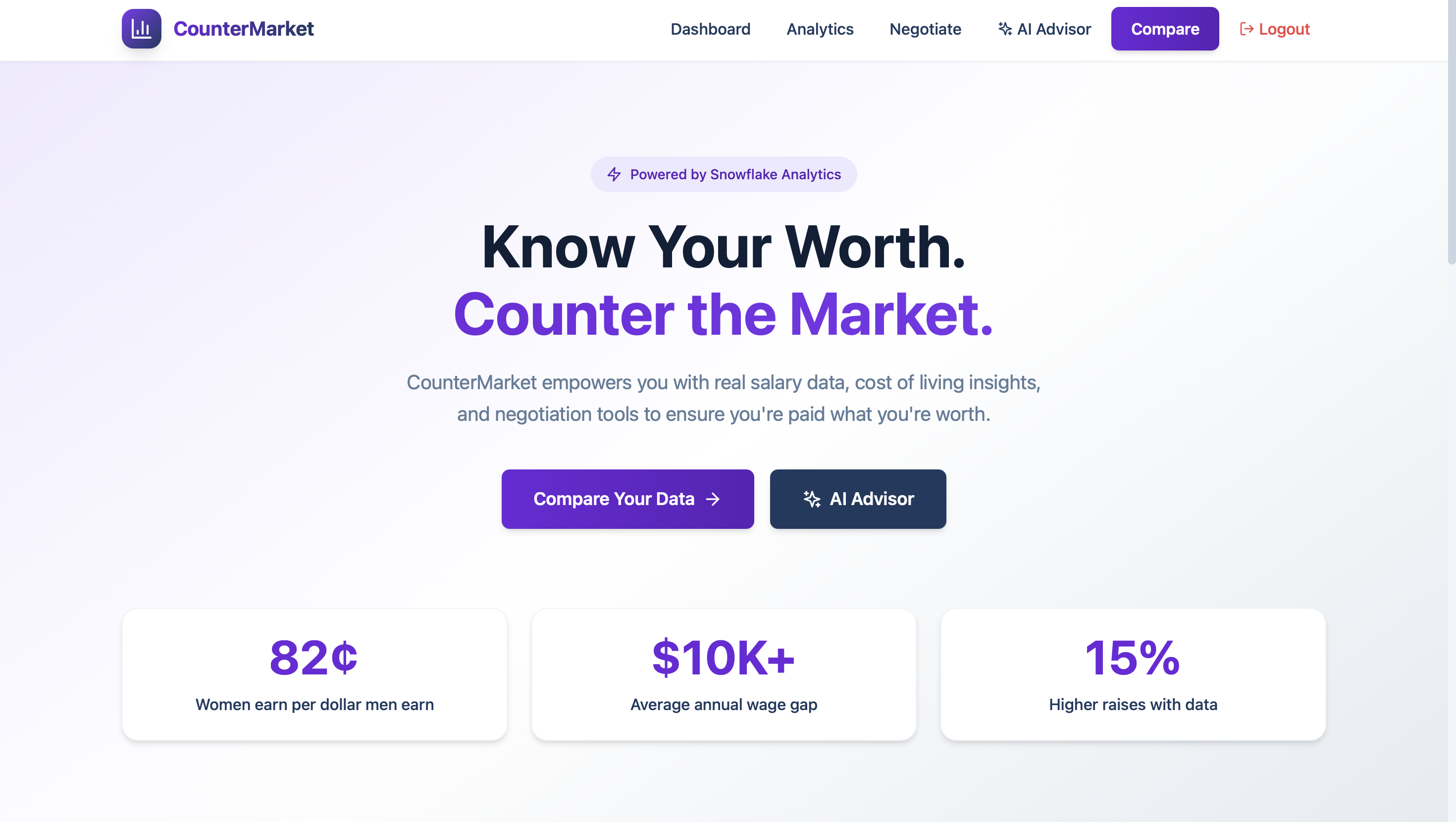 CounterMarket helps users understand their market value and negotiate fair pay using data and AI. It compares a user’s salary to market percentiles, visualizes pay gaps by gender and ethnicity, and adjusts expectations using cost of living by metro area. It also generates negotiation scripts and provides an AI salary advisor so users can turn analysis into action immediately.