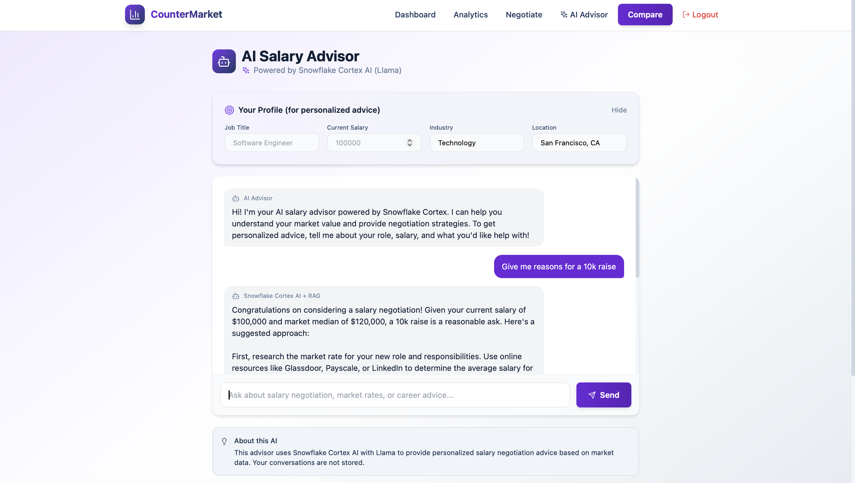 We built a React frontend with Tailwind and Recharts for charts, and a Python Flask backend that serves analytics endpoints. Salary records and the negotiation knowledge base live in Snowflake, where we compute market percentiles using Snowflake SQL. For AI, we use Snowflake Cortex with Llama 3.1 8b for responses, and E5 base v2 embeddings for semantic retrieval. Our RAG flow embeds the user question, retrieves the top relevant negotiation articles using vector cosine similarity, and then generates grounded advice and scripts using the retrieved context plus the user’s market results.