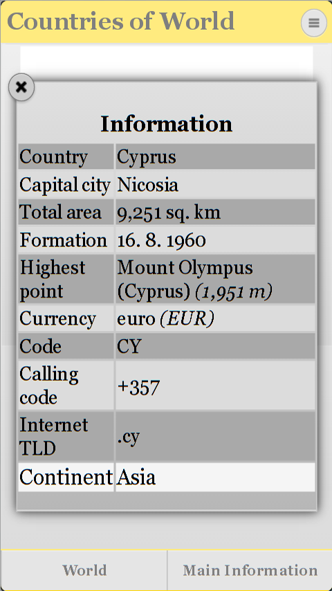 Countries of World gives main information ( capital, currency, area, flag, etc.) about countries. Search by country name and other criteria. Try it out www.istacksoftware.com