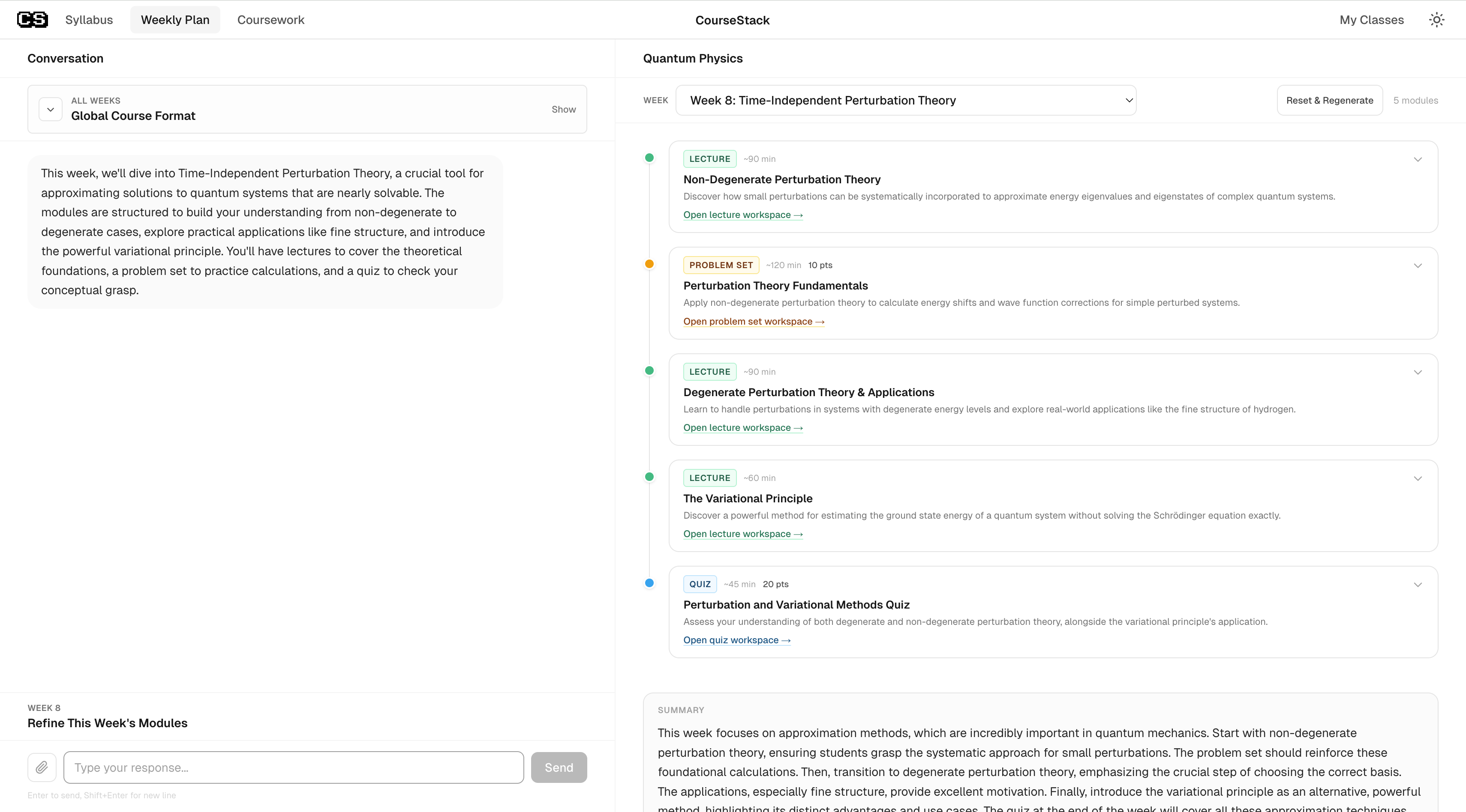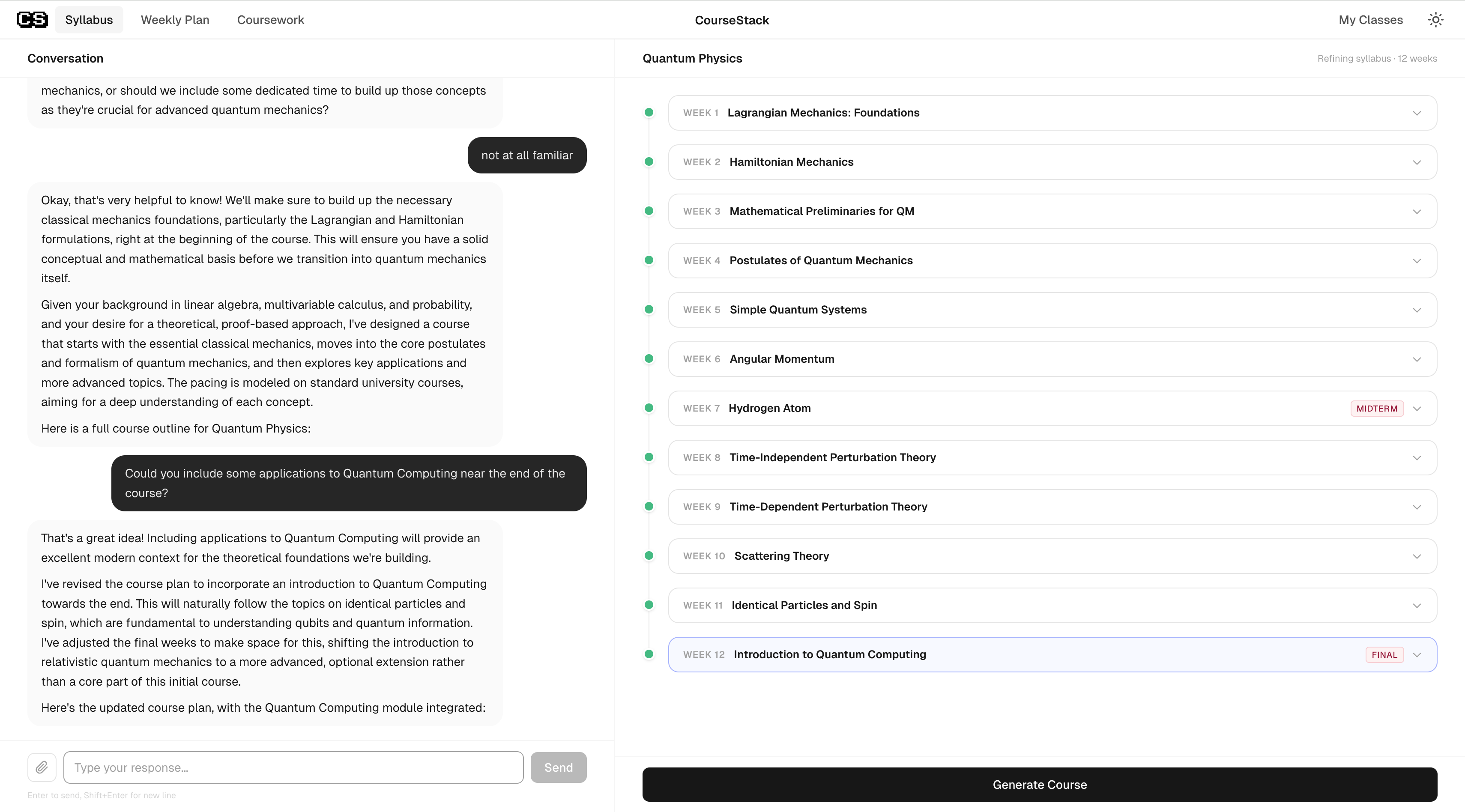 Given its great variety of functionalities, we are proud of completing the full stack of CourseStack within the limited time, especially the automatically generated lecture notes and weekly plans.