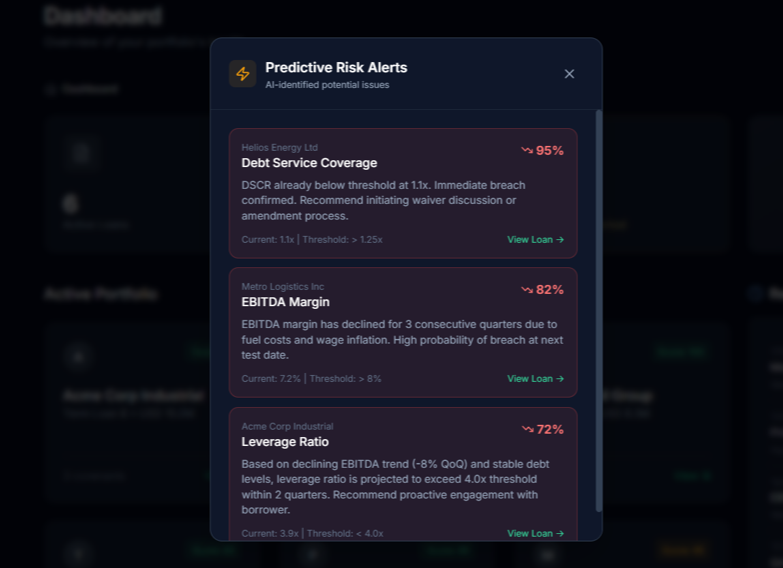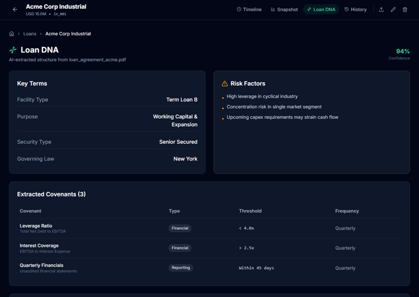 We asked ourselves: What if AI could read loan documents the way an experienced credit analyst does? What if covenant monitoring could be proactive instead of reactive?