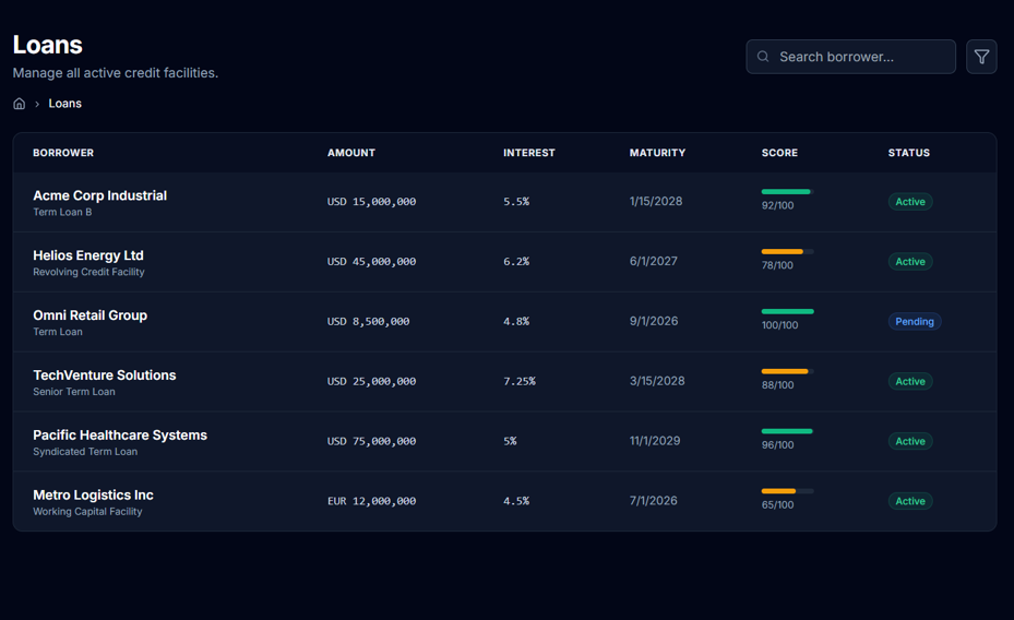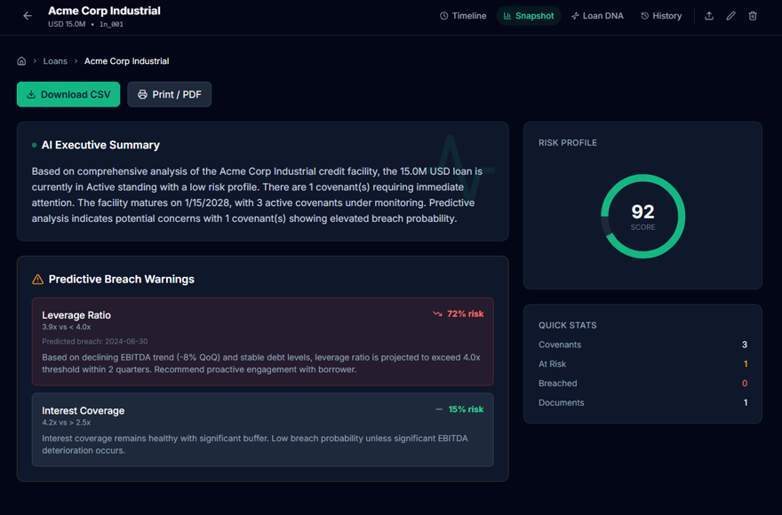 See the real-time health of every loan at a glance. Compliance scores, covenant status, risk indicators are all updated automatically. The AI generates executive summaries that would take analysts hours to write.
