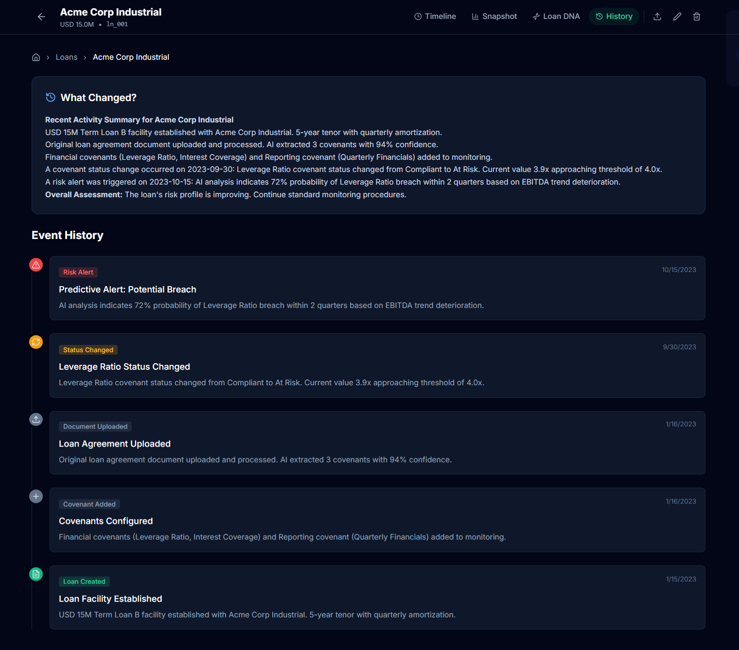 - Three-layer architecture (DNA, Snapshot, Timeline) mirrors how credit analysts actually think about loans