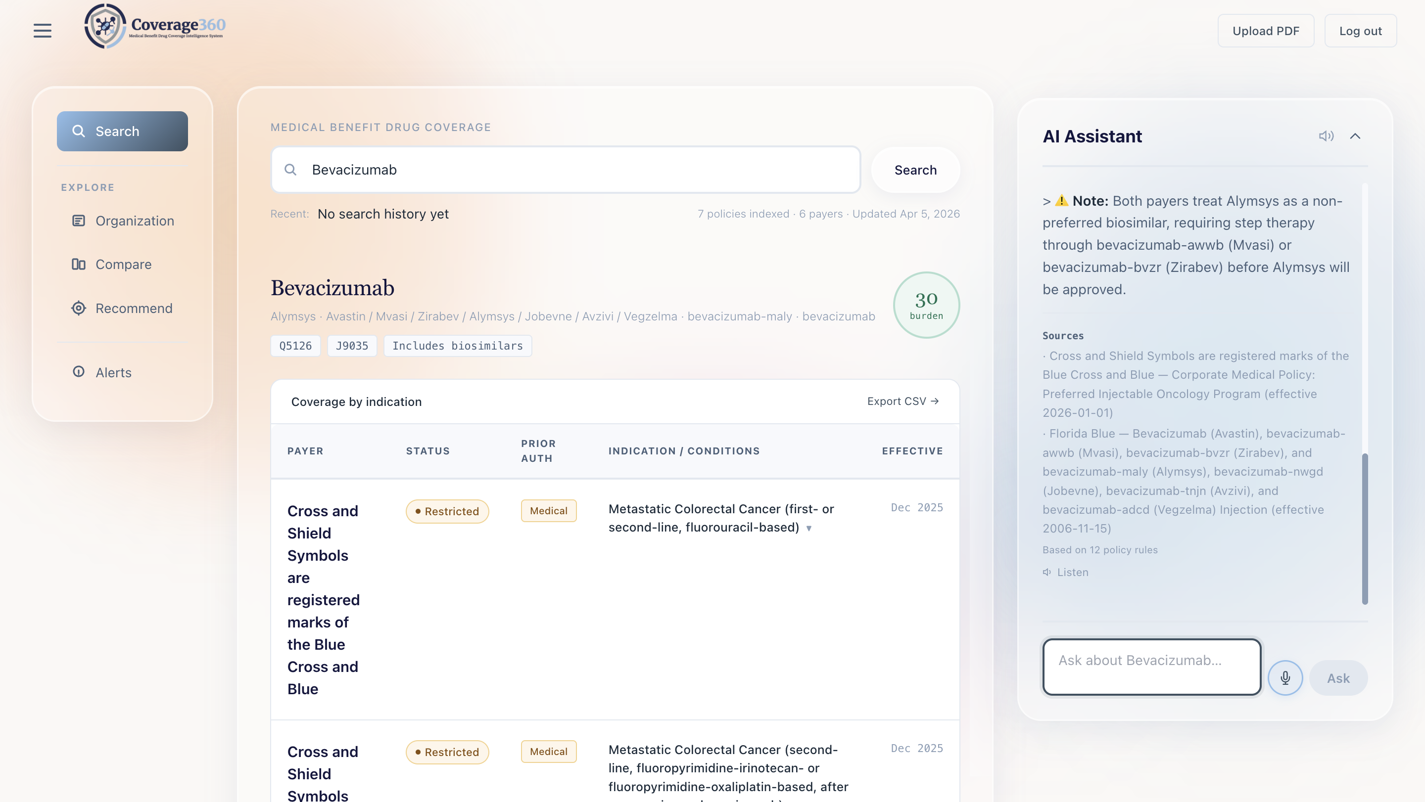 - Coverage Search: Search by brand or generic name to get a normalized table across all payers instantly, with a burden score that puts a number on how hard a drug is to get covered