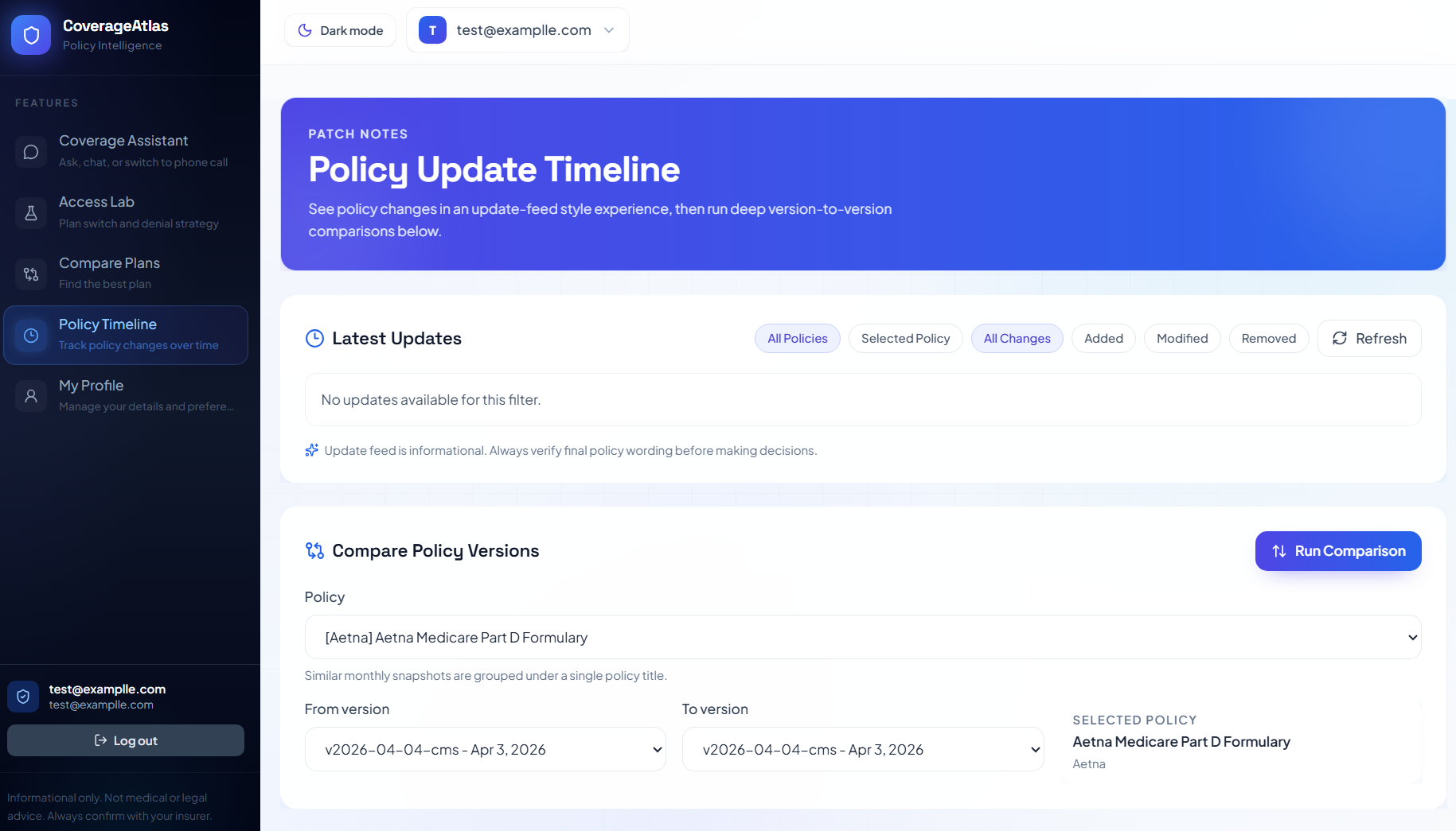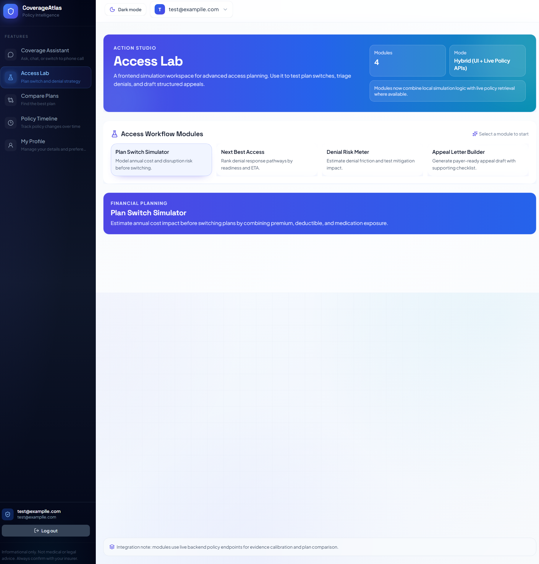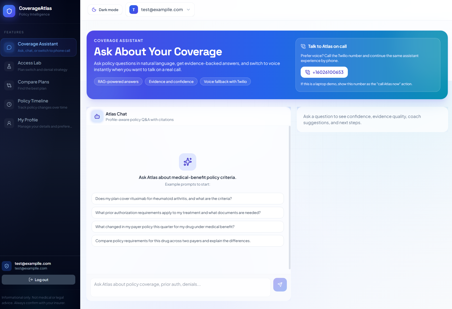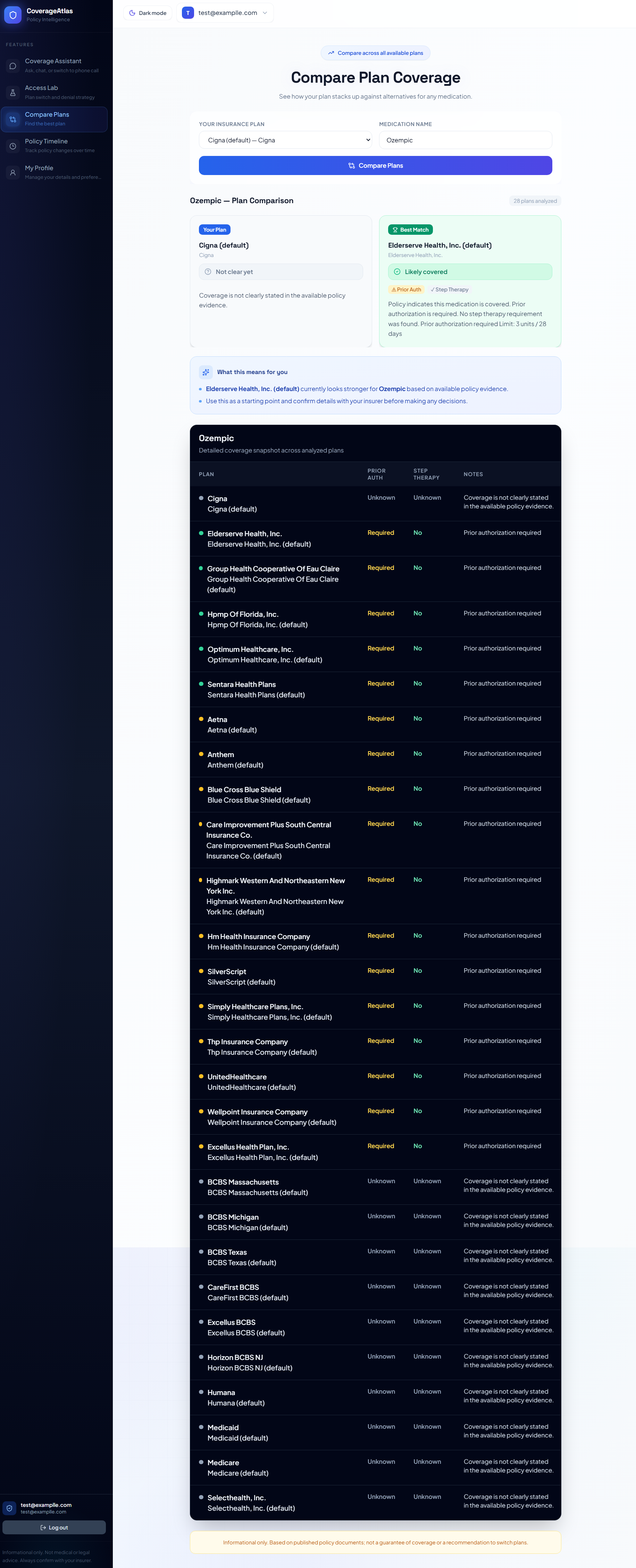 What it does CoverageAtlas turns messy insurance policy documents into clear, actionable guidance. It lets users ask plain-language questions and get evidence-backed answers with citations, compare coverage across plans, track policy changes over time, and explore practical access tools like denial-risk estimation, appeal-letter generation, next-best access recommendations, and plan-switch simulation.