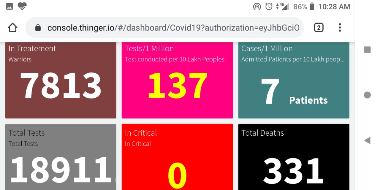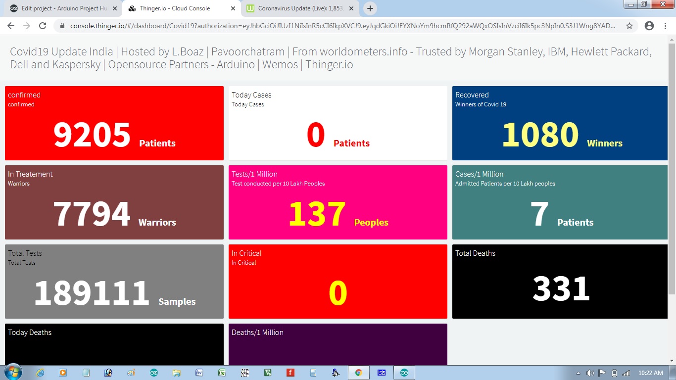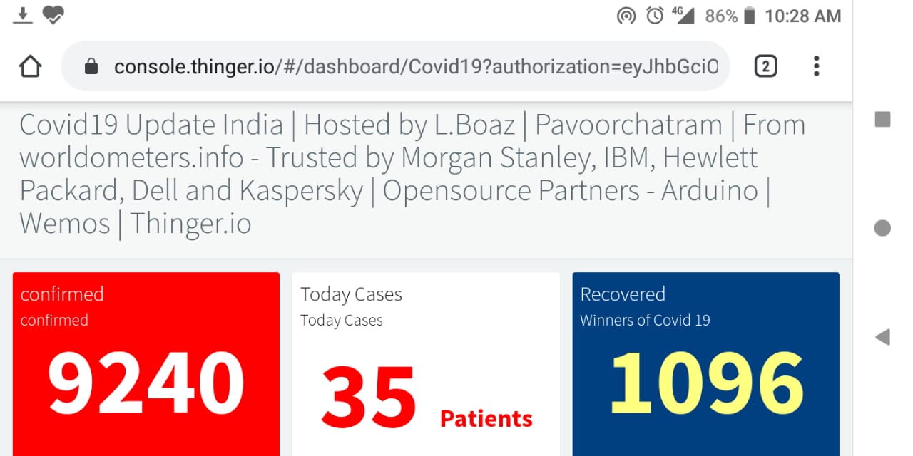 - NodeMCU any one or Wemos D1 development Board. Get a free dashboard from thinger.io website. Free one I preferred this one. Then download thinger library for arduino from the documentation page it is here (everything is well documented) so follow the instructions. http://coronavirus-19-api.herokuapp.com/countries/ go to this page and select your nation This is the data from the website api I choose India so go to this page http://coronavirus-19-api.herokuapp.com/countries/India This page gives the variable names that actually i need.
