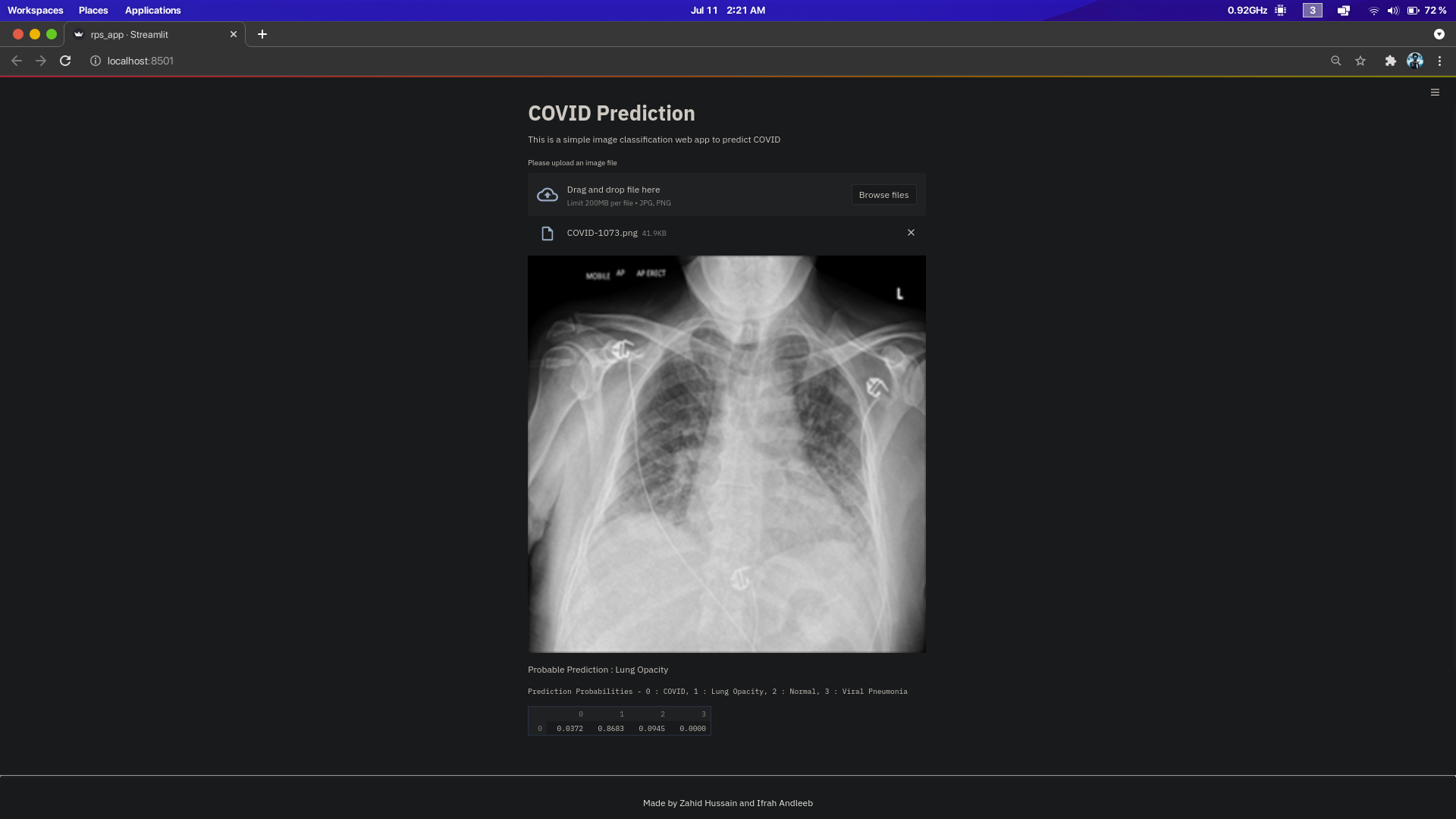 We built it using Tensorflow 2.x using Python. We have developed a Convolutional Neural Network model with an average accuracy of more than 85%.