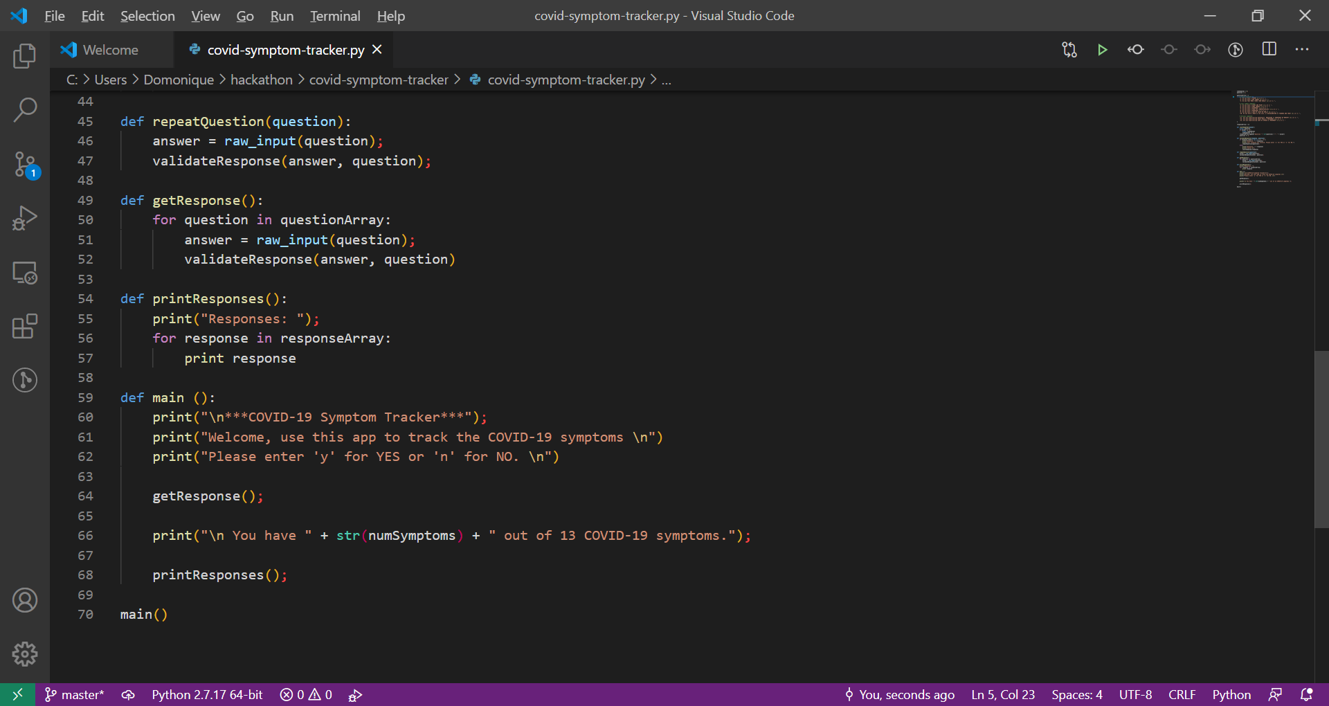 We used Visual Studio Code as a text editor and use Python as our coding language. We also searched COVID-19 symptoms on the World Health Organization (WHO) website.