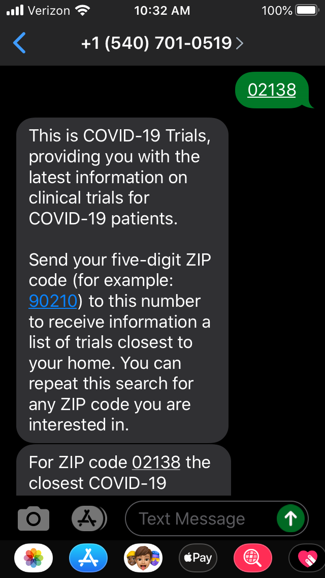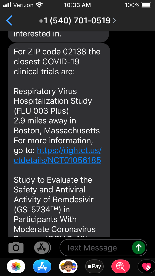 Thus, I created a small app where you can send your five digit ZIP code via SMS (US only for now) and you will receive an SMS back showing you the five closest COVID-19 clinical trials to your location. You can also filter based on keywords you send. For example, if you want to look for a patient registries, you can send "Keywords: registry". You just have to text 540-701-0519 -- 10519 as in CV-19.