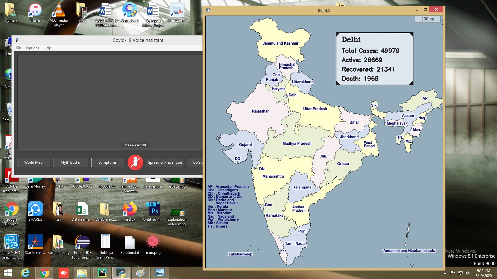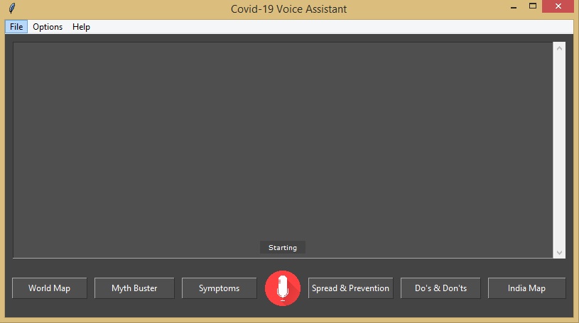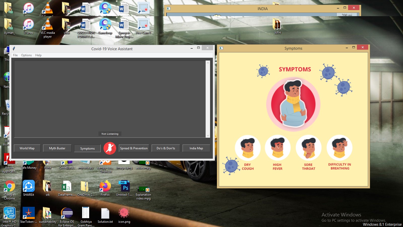 It have Following features: -It can be used to know about corona virus. -It track live number of corona cases in any country or in any states of India.(By voice command or on Map by moving mouse cursor over the country or states) -It can be used to know the symptoms of covid-19. -It can be used to know how covid-19 spreads and what we can do to prevent it. -It can be used to know the Do's and Don't's about covid-19. -It can be used to check the fact about the myths that are circulating about covid-19. -It will send you notifications about symptoms,prevention and fact about myths in regular time interval so, it will keep you updated while you're working on your machine.