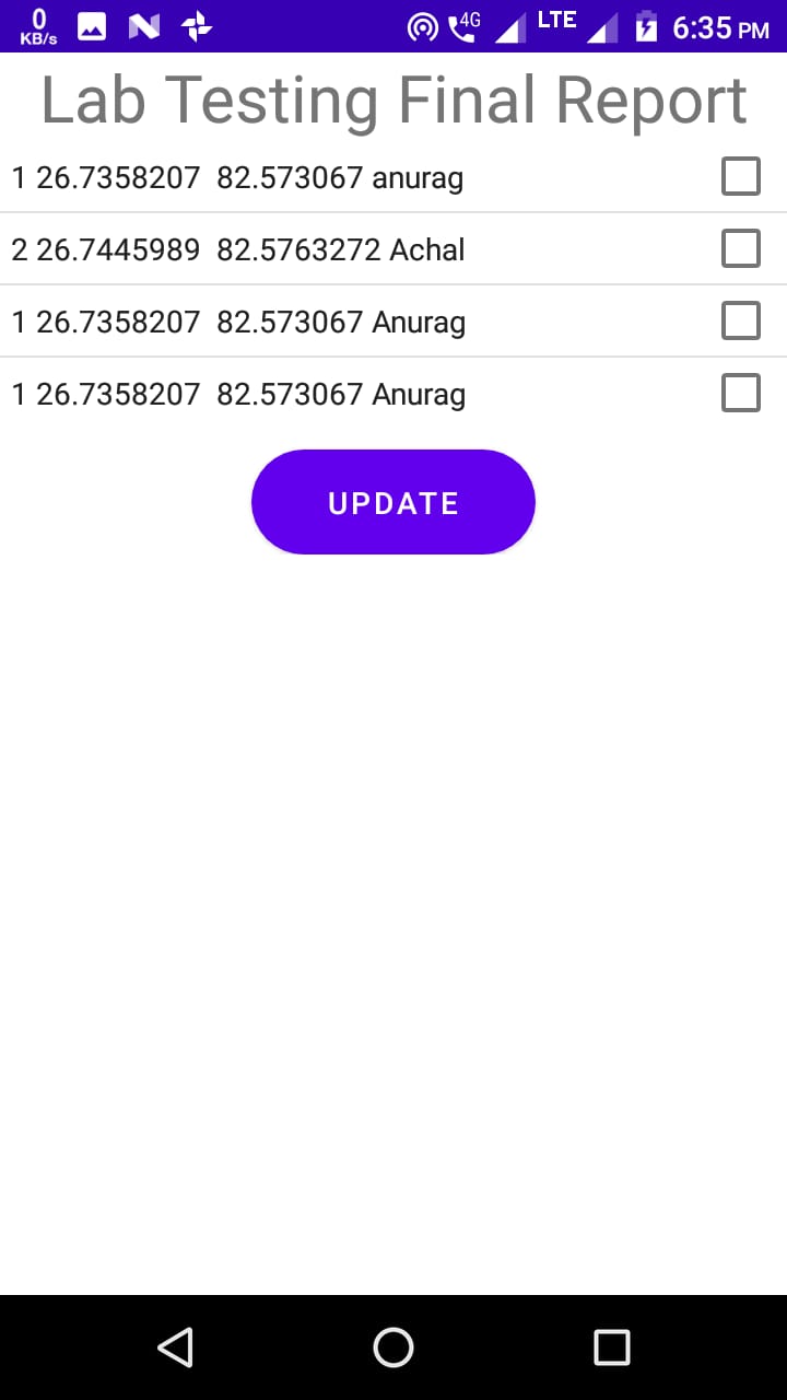 We fetch the data from google map Api and we made a registation and login page for Doctor and after registation we made door to door testing where doctor put name pf patient and sample id it automatic took the current LatLan and update to database and now we make LabTesting Activity where we mark the people having positive and at the end we make Map where we show the people name with marker on there Latitude Longitude(Only Positive people)