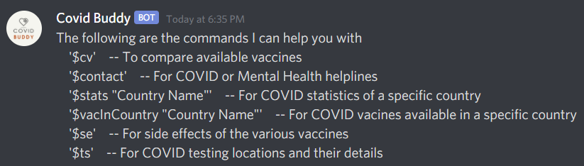 Covid Bot provides users with information about covid statistics, symptoms, helplines, and available vaccines. It lets the users compare vaccines and locate testing/vaccination sites.