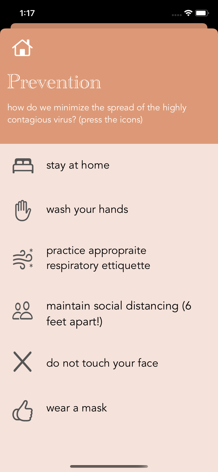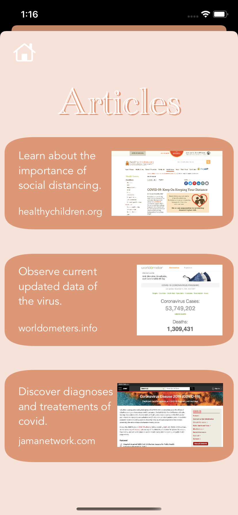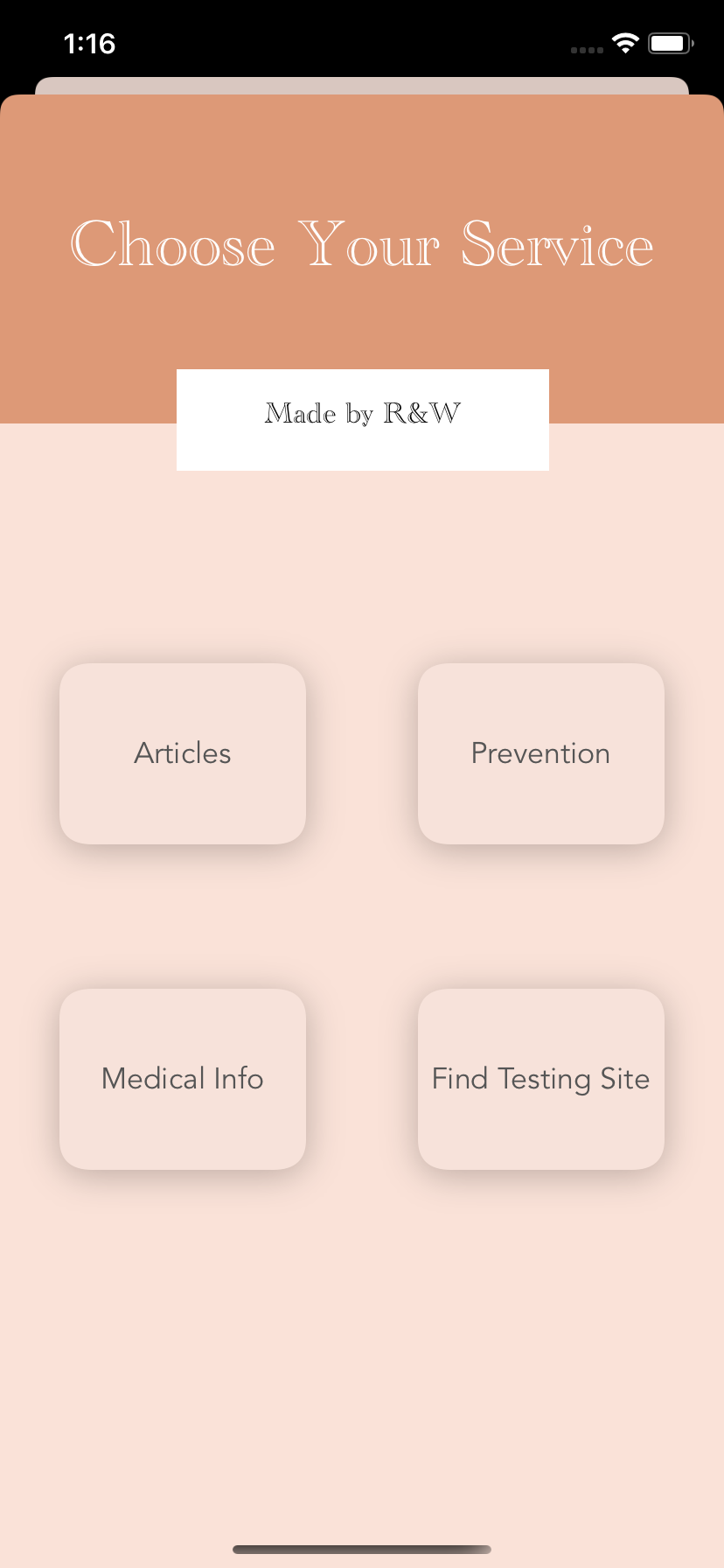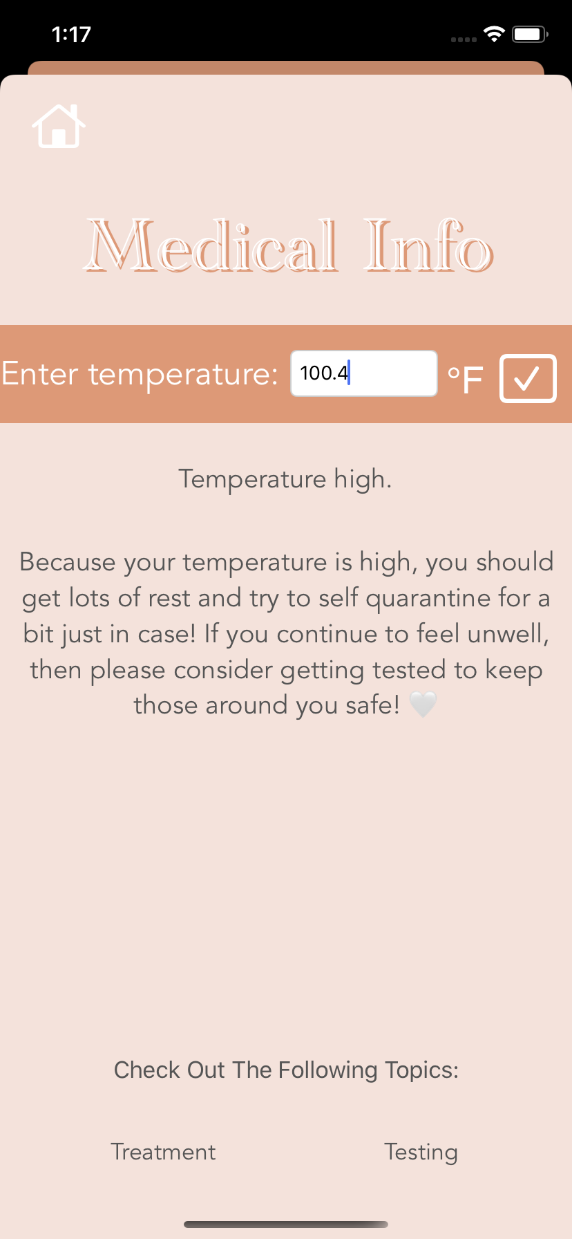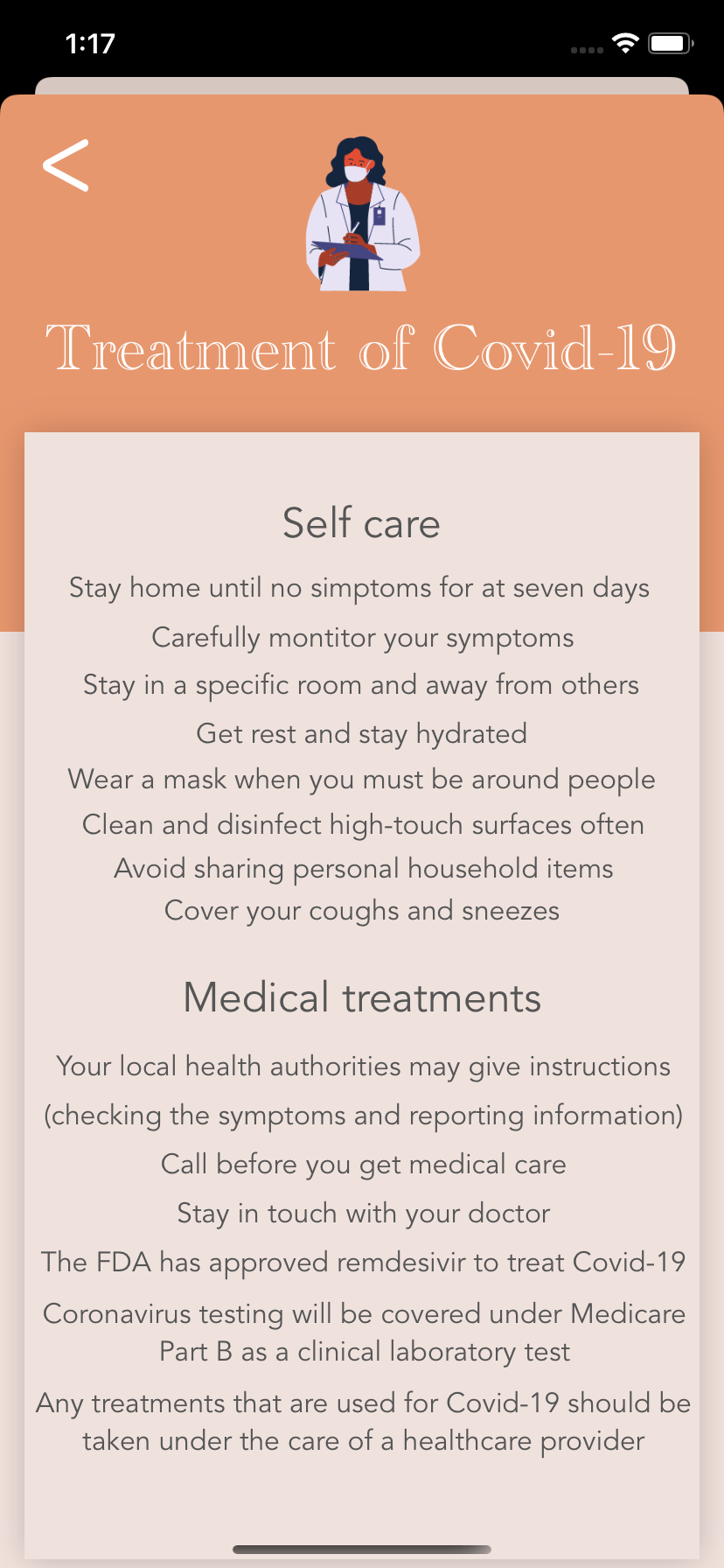 COVID Care, an iOS app, provides information about Covid-19. After passing the home screen, users will confront four topics: articles, prevention, medical info, and find a testing site. In articles, users choose from a selection of related articles to study more about the pandemic. Prevention advises the users on how they should stop the risk of spreading the virus. Upon entering medical info, users can determine whether or not they have a fever by inserting their temperature. Two buttons located on the bottom segue the user to two pages: one that gives the user a self-assessment and suggests whether or not to take a covid test, and another that provides extra info about treatments. Lastly, the find a testing site displays nearby covid testing sites to the user.