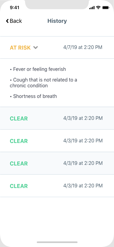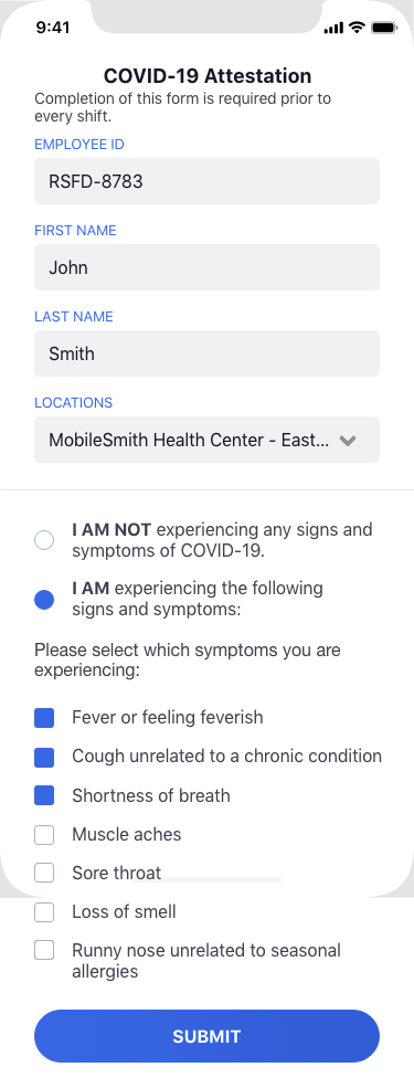 COVIDClear is the mobile app symptom attestation solution for employers to assess and track the COVID-19 status of their workforce. By answering a brief series of symptom screening questions, mobile users can affirm if they are COVID-19 symptom free or select which symptoms they are currently experiencing.