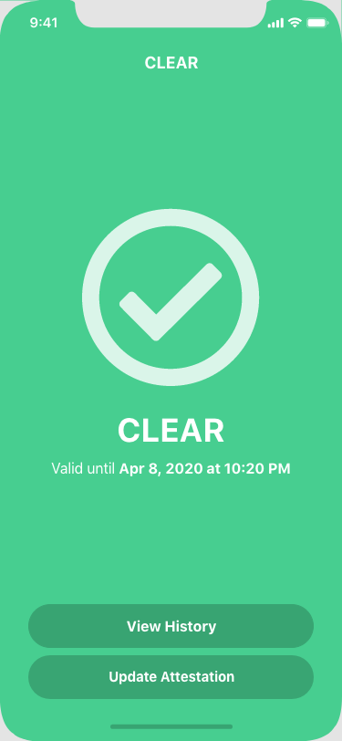 The COVID-19 pandemic has created a "new" normal for managing large-scale infectious disease as well as the management of populations seeking to successfully return to normative activities. The ability to safely and confidently transition from rigid social-distancing to in-person work or public routine activities requires an assurance that employees or visitors entering a facility can attest to being free of symptoms associated with the COVID-19 virus. We needed a system allowing each employee or visitor to attest to their COVID-19 symptom status and have that information saved for HR and environmental safety purposes. In addition to supporting the attestation process, COVIDClear also tracks user work locations to determine infection "hotspots" on your campus or environment. COVIDClear is of particular relevance in supporting healthcare employees protect their patients, co-workers, themselves and their families as they confront the pandemic in their hospitals and care delivery environments.